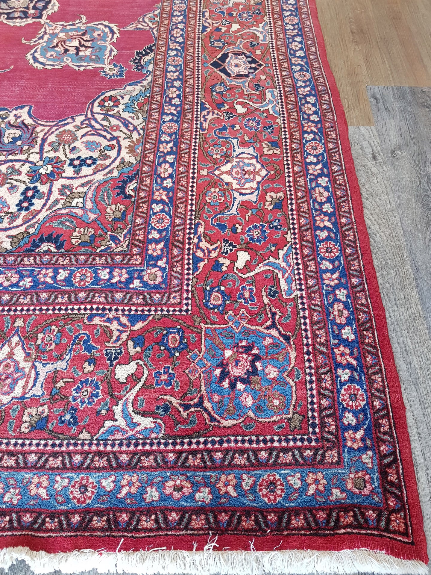 Hand-knotted in the tribal heartlands of Bakhtiari, this semi-antique Persian rug is a striking testament to enduring craftsmanship and bold design. Its central medallion—geometric in form yet floral in spirit—sits within a spacious burgundy field, framed by palmettes, rosettes, and flowing vine scrolls that echo classical Persian motifs.