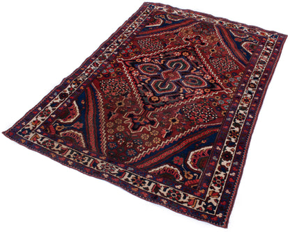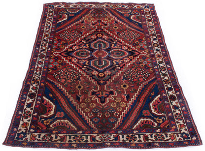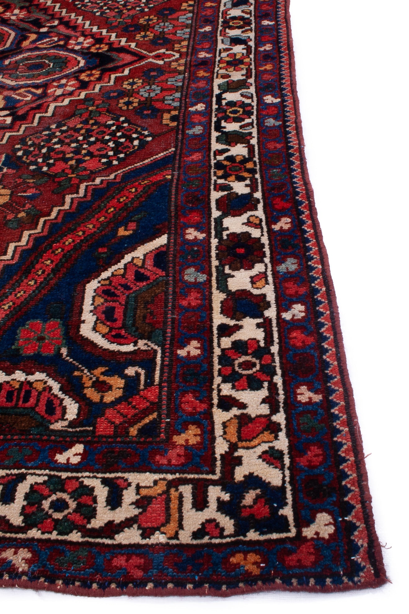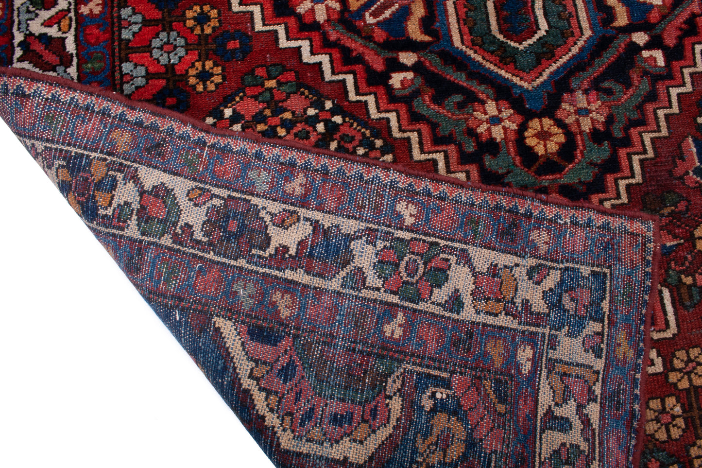This Semi-Antique Persian Bakhtiari Rug is hand-knotted in Bakhtiari, Iran. Its unique rectangular shape, wool pile, and cotton foundation make it a beautiful piece of art featuring a central medallion design with teal, blue, and ivory colors. Perfect for adding flair and sophistication to any room.