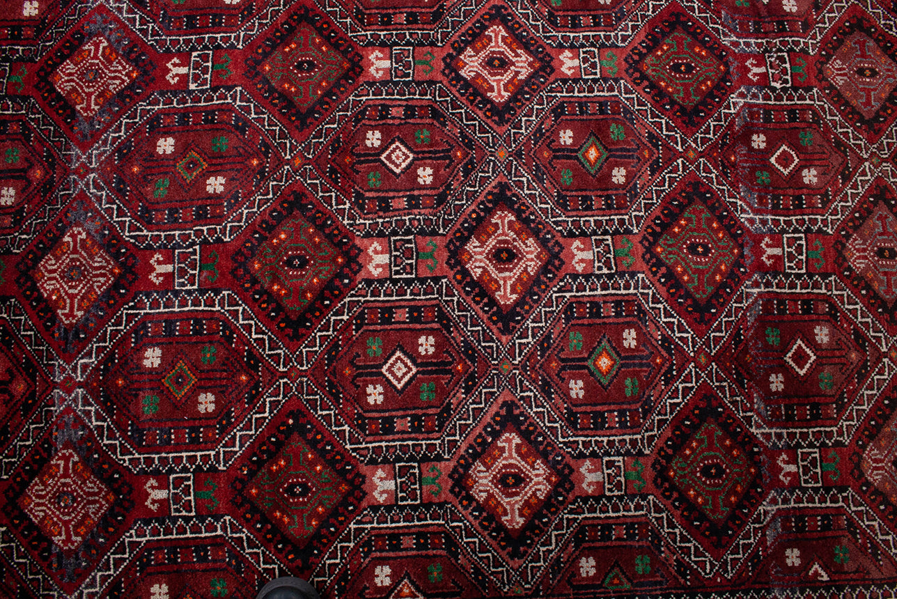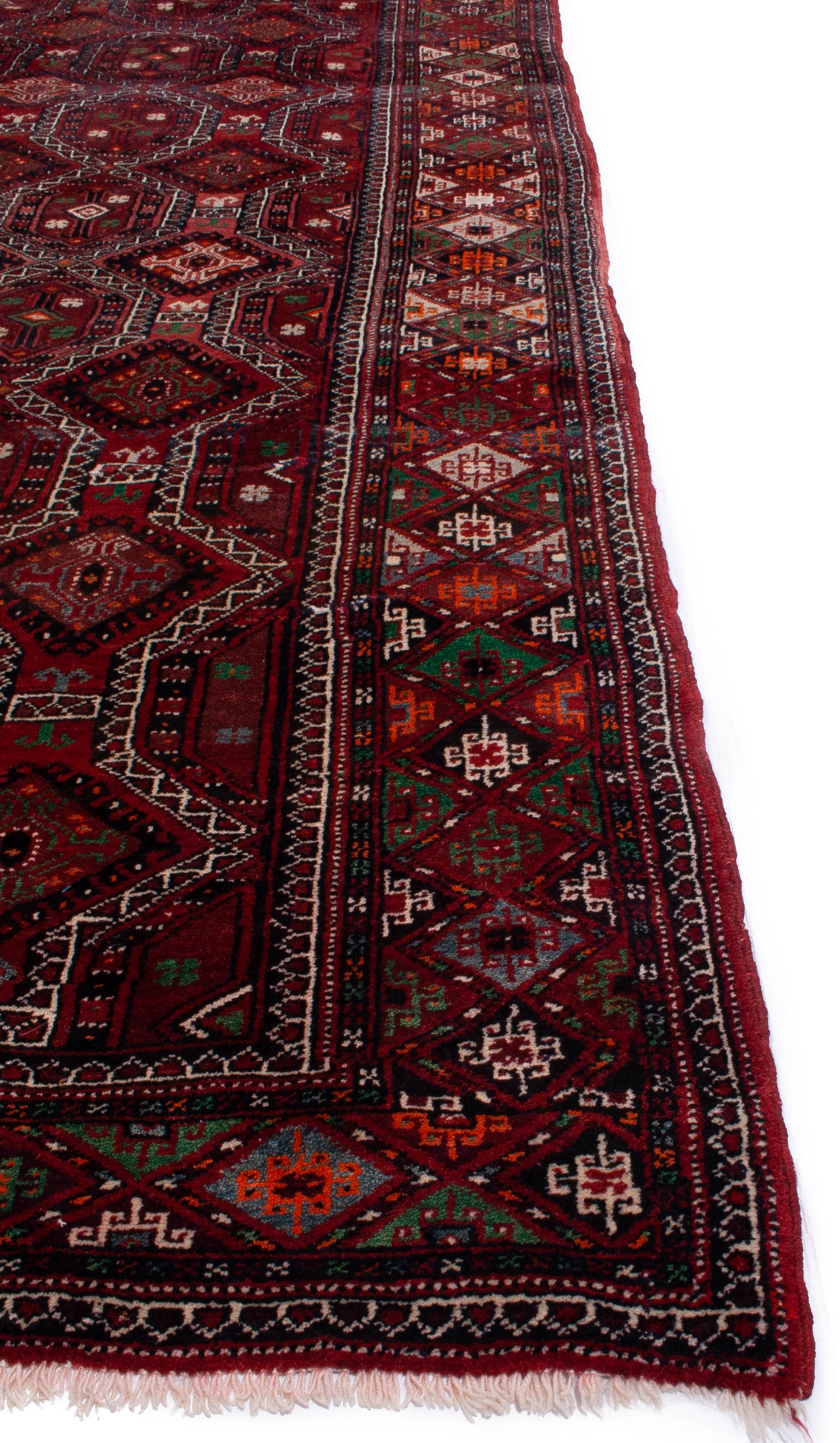 The rug features a captivating array of geometric patterns, predominantly in deep reds, accented with earthy tones of green and ivory. The central field is adorned with a series of interconnected diamond motifs, framed by intricate borders that enhance the overall design. The use of wool for the pile ensures a soft texture, while the cotton foundation provides durability. The harmonious blend of colours and patterns reflects the Baluch tradition, where each element carries its own symbolic significance.