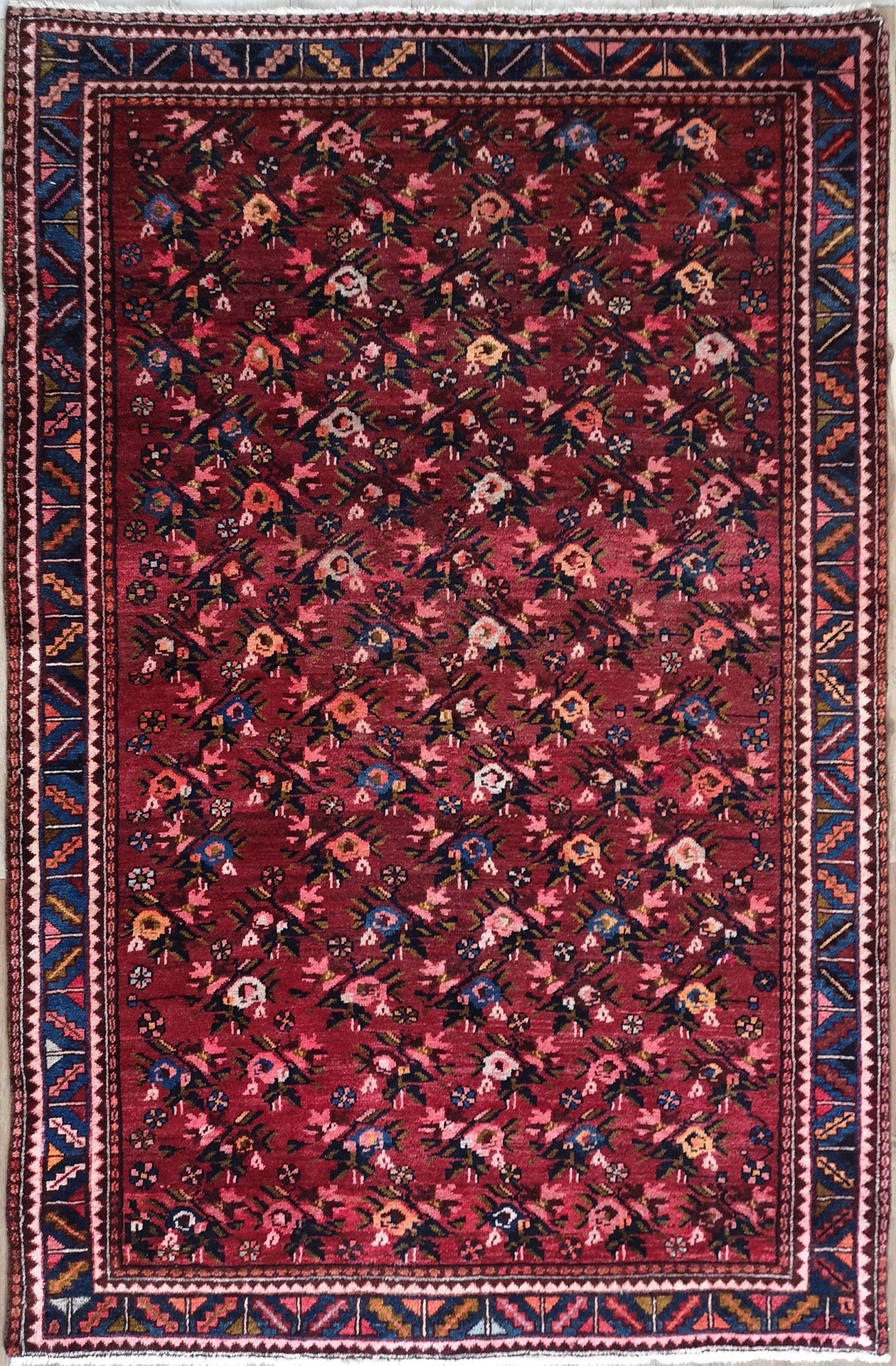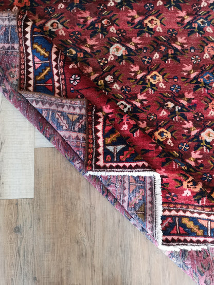 Hand-knotted in the storied weaving region of Hamadan, this semi-antique Persian rug reflects the enduring artistry of village craftsmanship. Its all-over floral pattern, rendered in a geometric layout, creates a sense of movement and symmetry, with stylised blossoms repeating across a deep burgundy field.