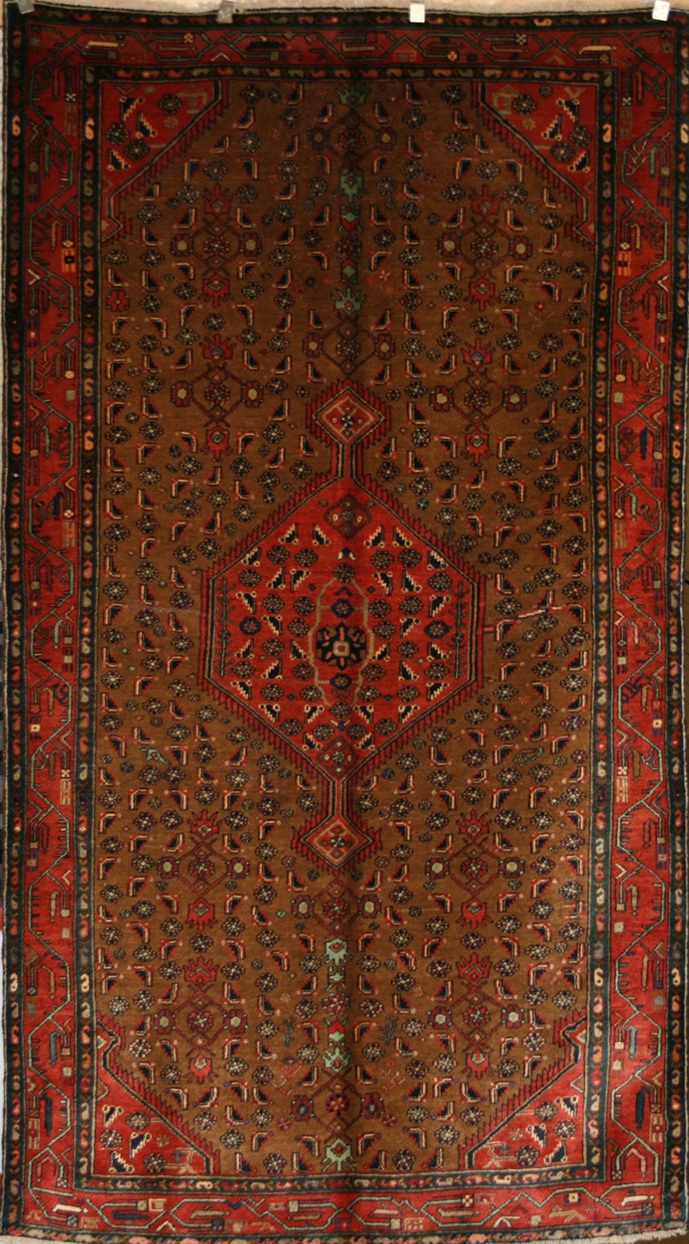 Hand-knotted in the historic weaving region of Hamadan, this semi-antique Persian rug embodies the bold geometry and tribal character that define the area's craftsmanship. Its hexagonal medallion sits within a field of mirrored Boteh motifs and angular forms, framed by zigzag spandrels and hook details that echo tribal symbolism.