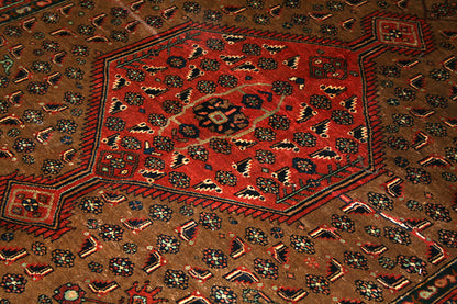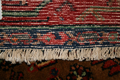 The warm palette of chocolate brown, brick red, and forest green is enriched by midnight blue and mustard accents, creating a strong contrast that highlights the medallion and border. The geometric vine border, set against a brick red ground, reinforces the rug’s symmetry and adds a sense of structure, while ivory guard bands provide subtle framing.
