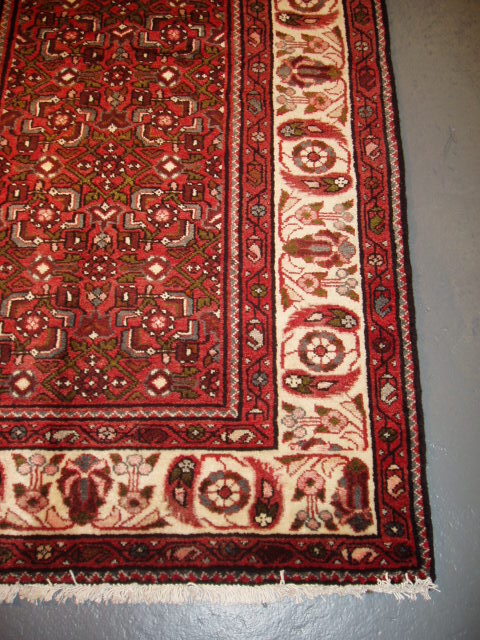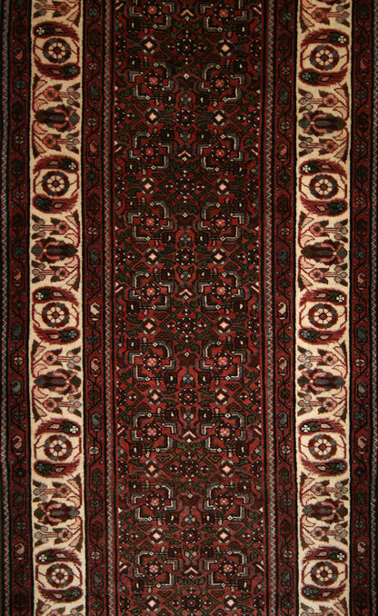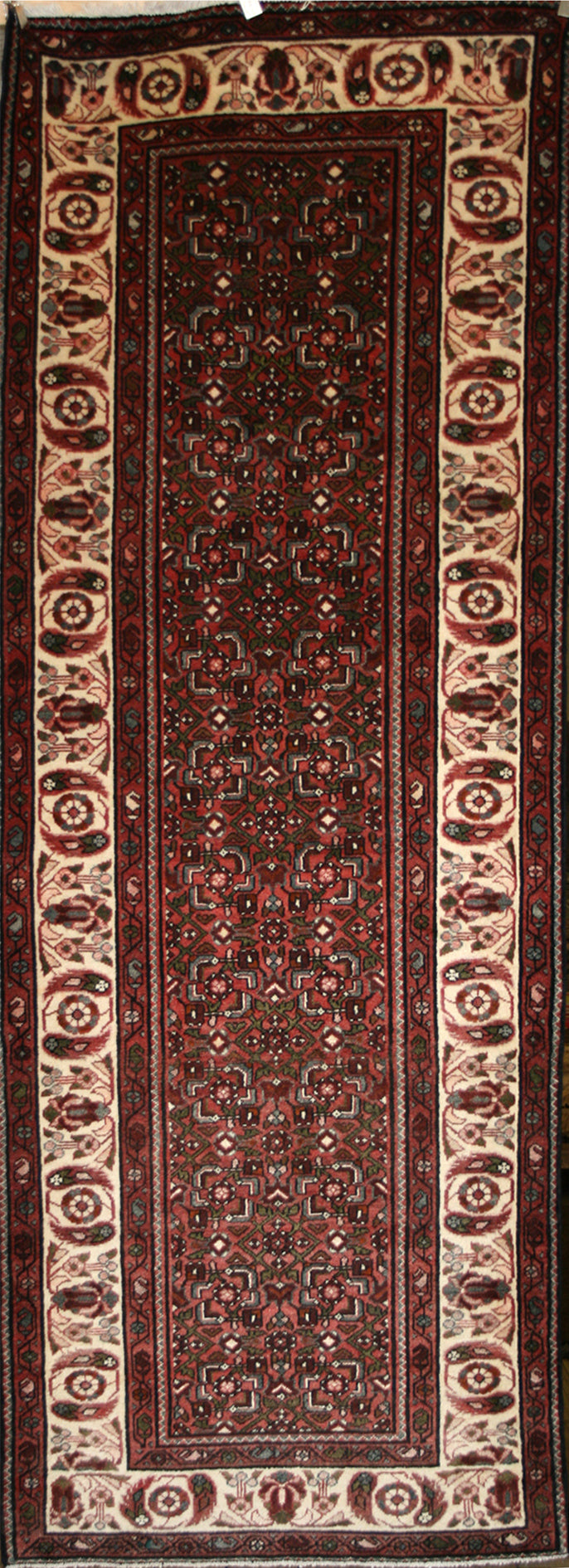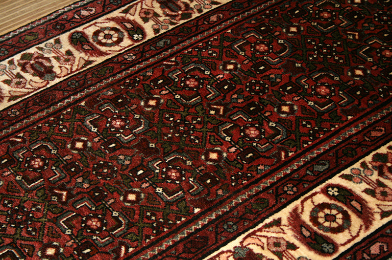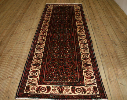 Hand-knotted in Hamadan, Iran, this semi-antique Persian runner reflects the enduring artistry of village weaving. Its all-over Herati design—featuring diamond shapes enclosing rosettes and stylised fish—forms a tightly arranged, mirrored pattern that speaks to the region’s love of structure and repetition.