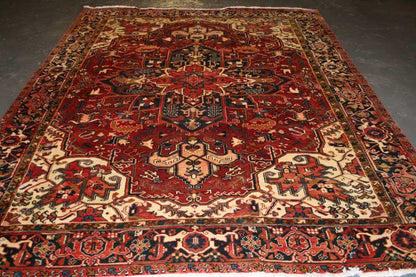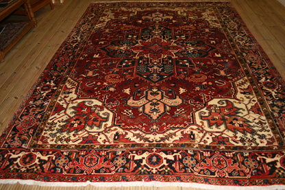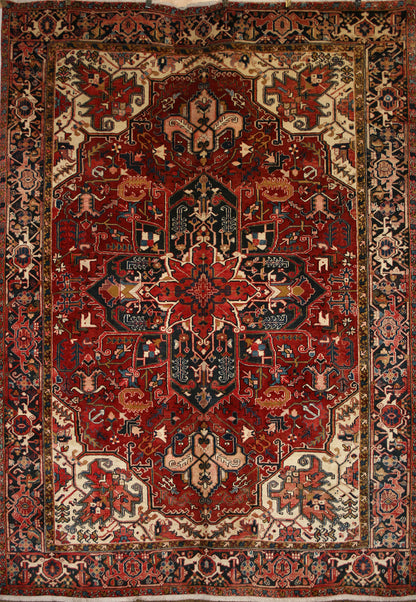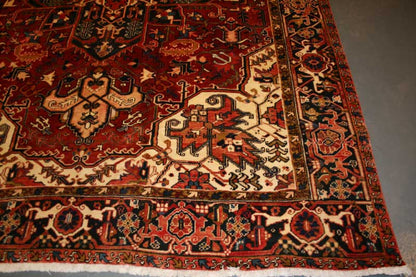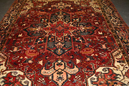 Hand-knotted in Heriz, Iran, this semi-antique Persian rug embodies the bold geometry and enduring character for which Heriz weavings are celebrated. At its centre lies a striking star-shaped medallion, set against a deep red field and framed by angular spandrels in ivory and beige. Palmettes, serrated leaves, and stylised floral forms fill the field in a mirrored, tribal arrangement, lending the piece its distinctive, rugged symmetry.