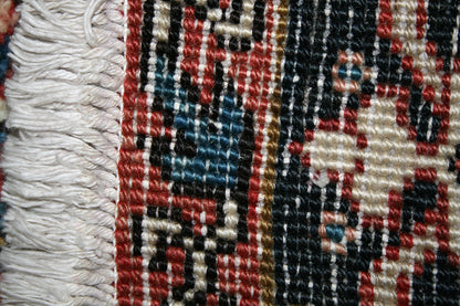 The navy border, adorned with rosettes and geometric vines, is flanked by slender guard bands that enhance the design’s structure. Warm tones of soft pink, light blue, and ivory lift the deep red and navy palette, creating a rich yet balanced contrast.