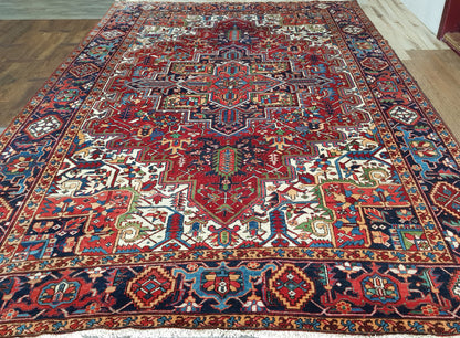 Hand-knotted in Heriz, Iran, this semi-antique Persian rug embodies the bold geometry and enduring strength that define Heriz weaving. Its angular medallion sits within a crimson field, framed by stylised palmettes, serrated leaves, and geometric floral forms that reflect the tribal character of the region’s design language.