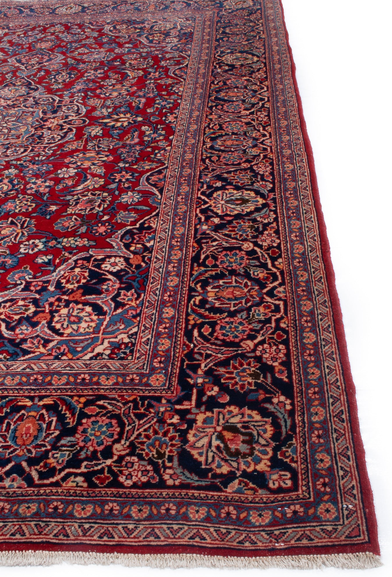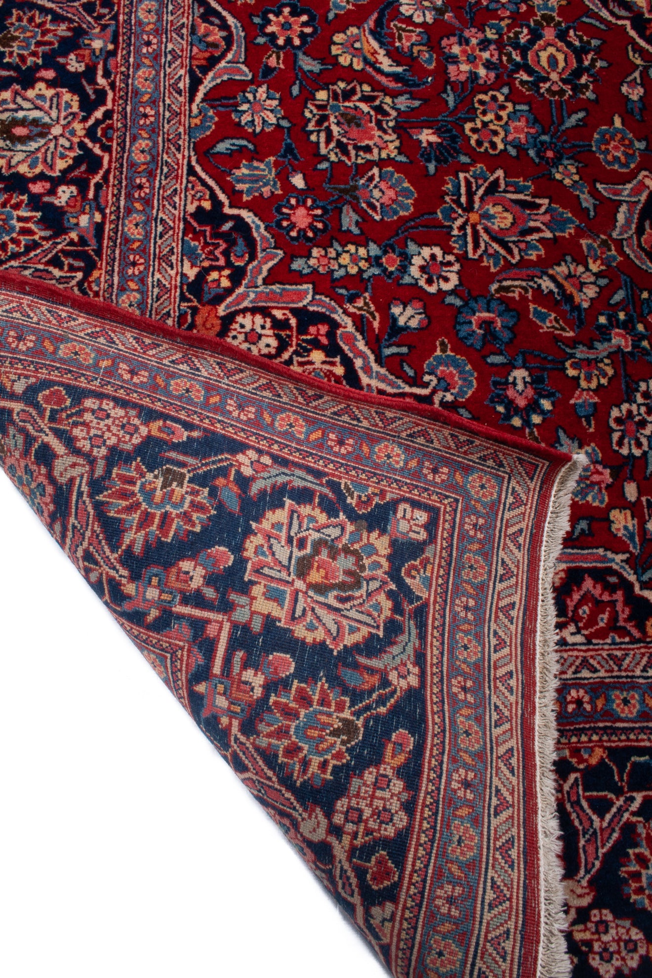 The deep crimson field is enriched with tones of navy, ivory, and sage, while accents of peach and light blue add subtle variation. A navy border, adorned with repeated palmettes and floral scrollwork, provides bold contrast, framed by finely detailed guard bands that enhance the rug’s symmetry.