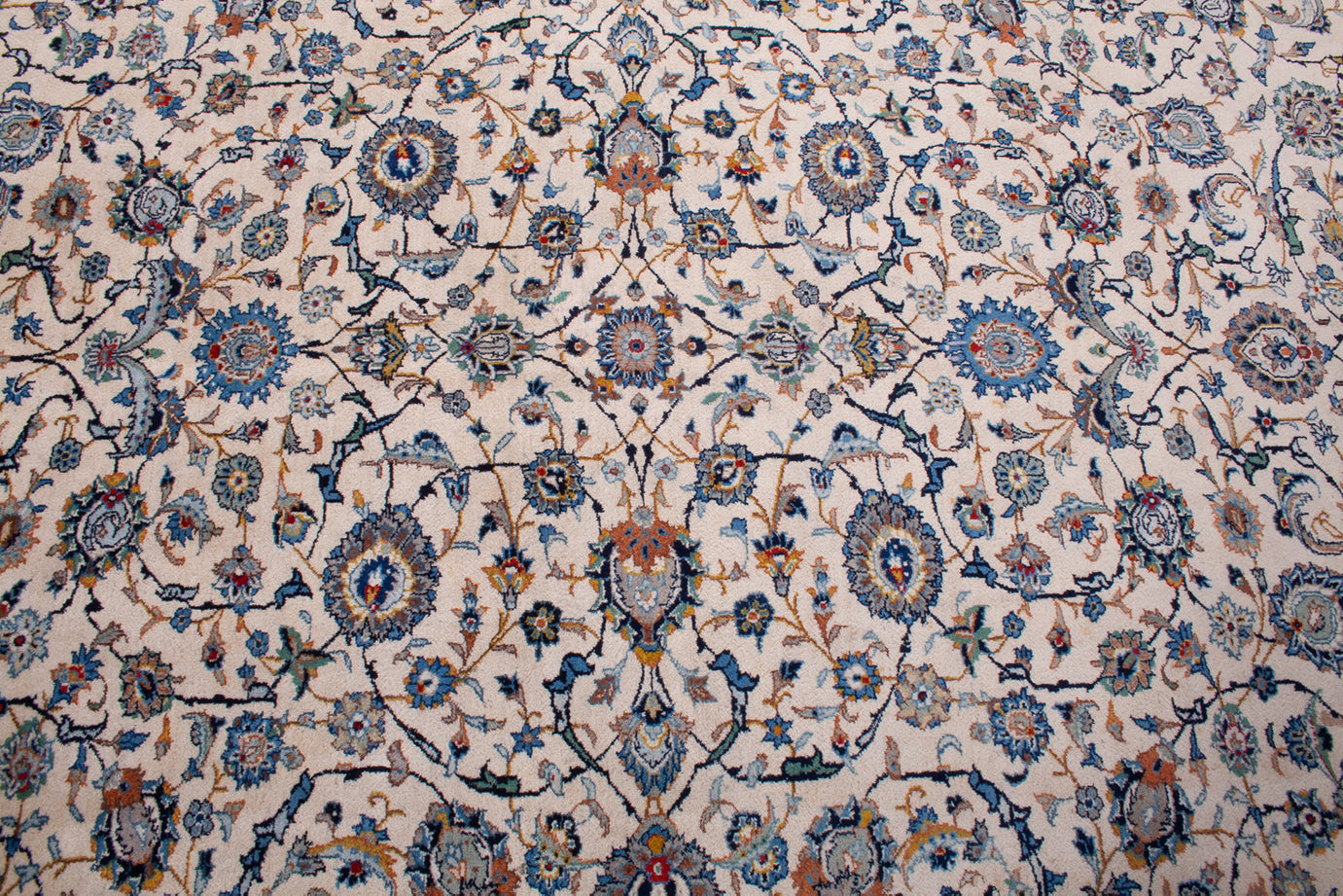 Hand-knotted in Kashan, one of Persia’s most esteemed weaving centres, this semi-antique rug embodies the refinement of classical design. Its all-over floral composition—featuring Shah Abbasi motifs, rosettes, and palmettes—flows across an ivory field with mirrored symmetry, creating a sense of balance and continuity.