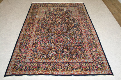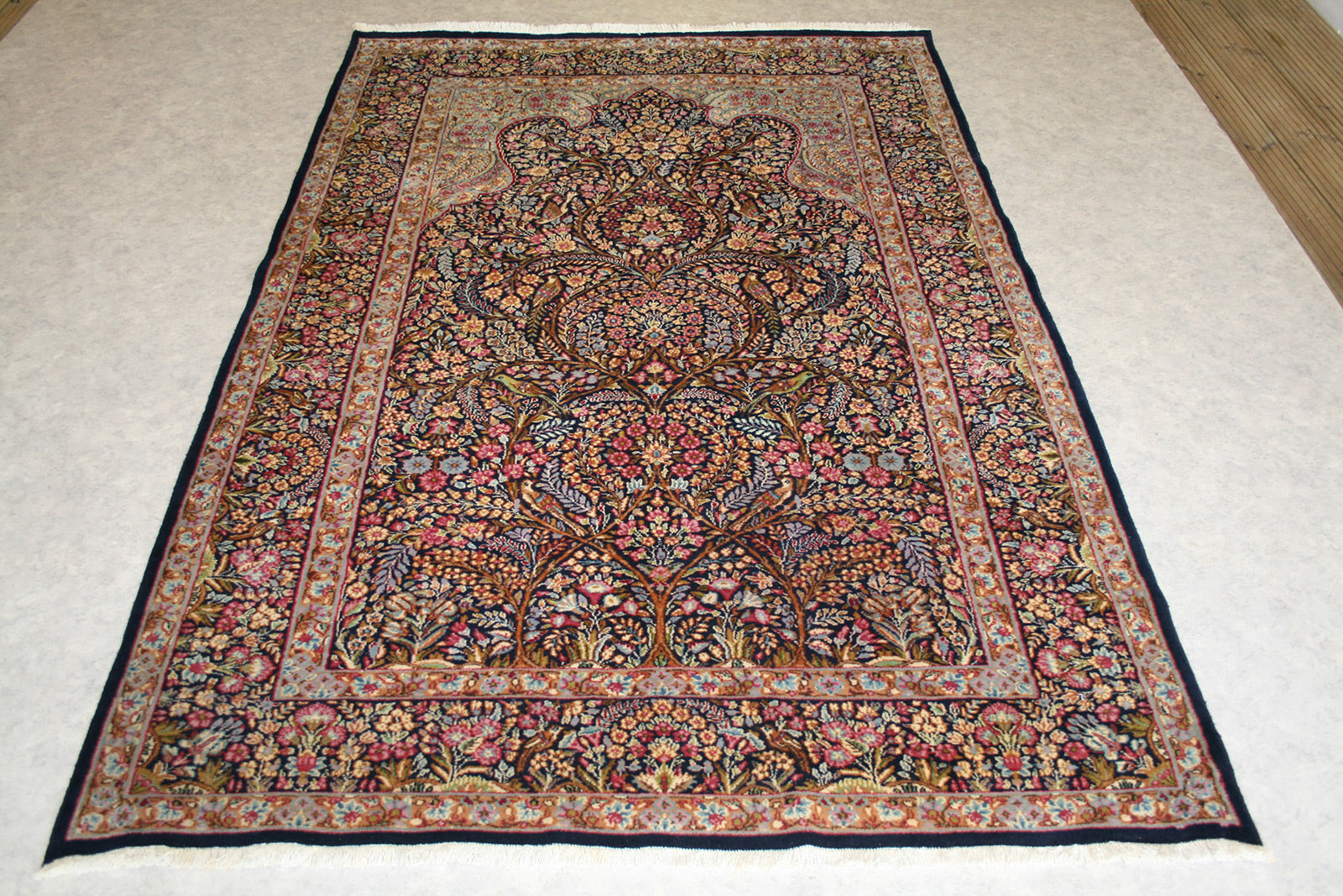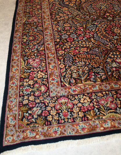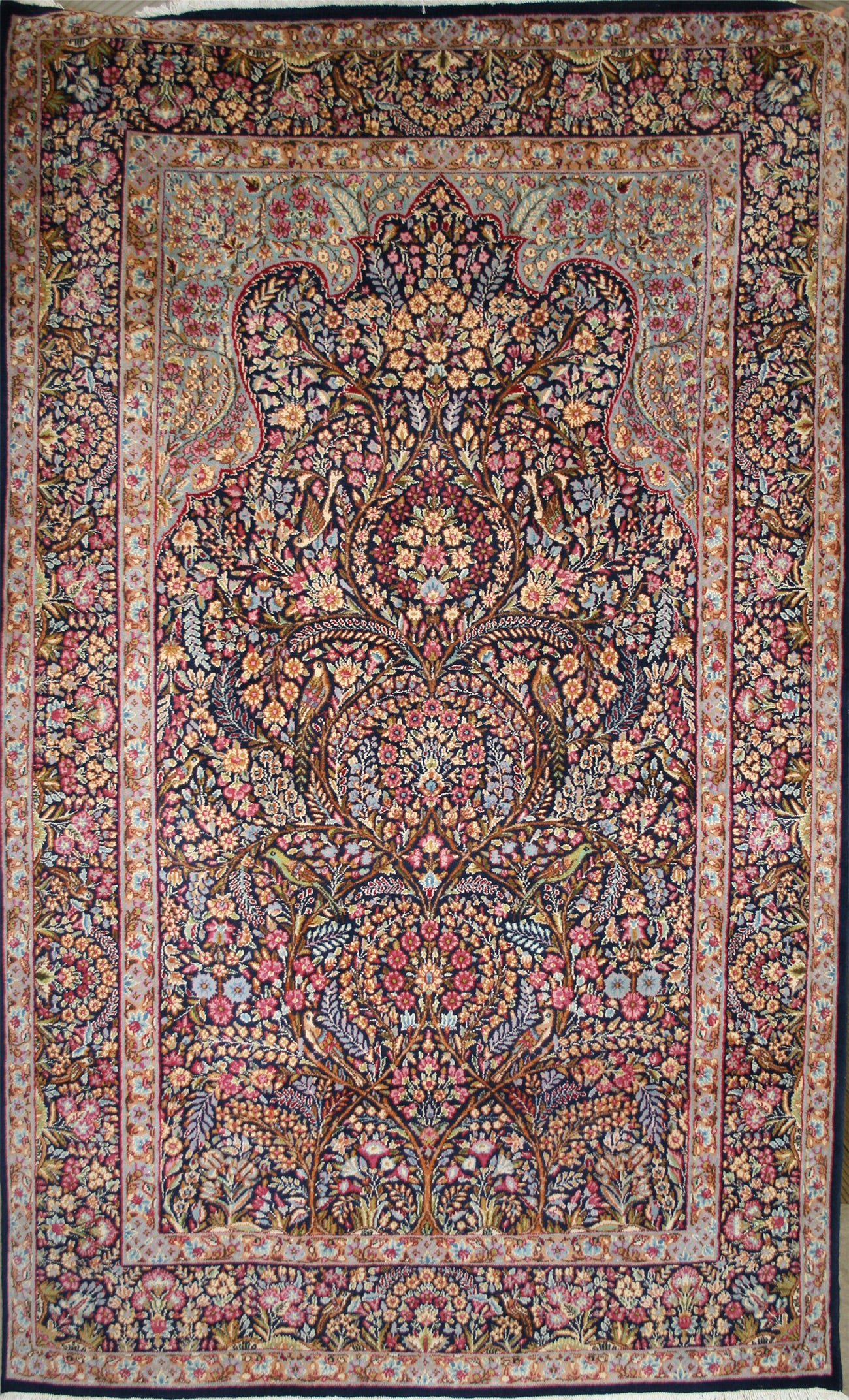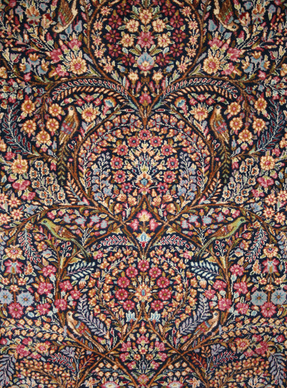 Hand-knotted in the storied workshops of Kerman, this semi-antique Persian rug embodies the grace and symbolism of the mihrab (prayer arch) design. Its navy-blue field, rich with floral tracery, birds, and mirrored symmetry, creates a sense of serenity and devotion.