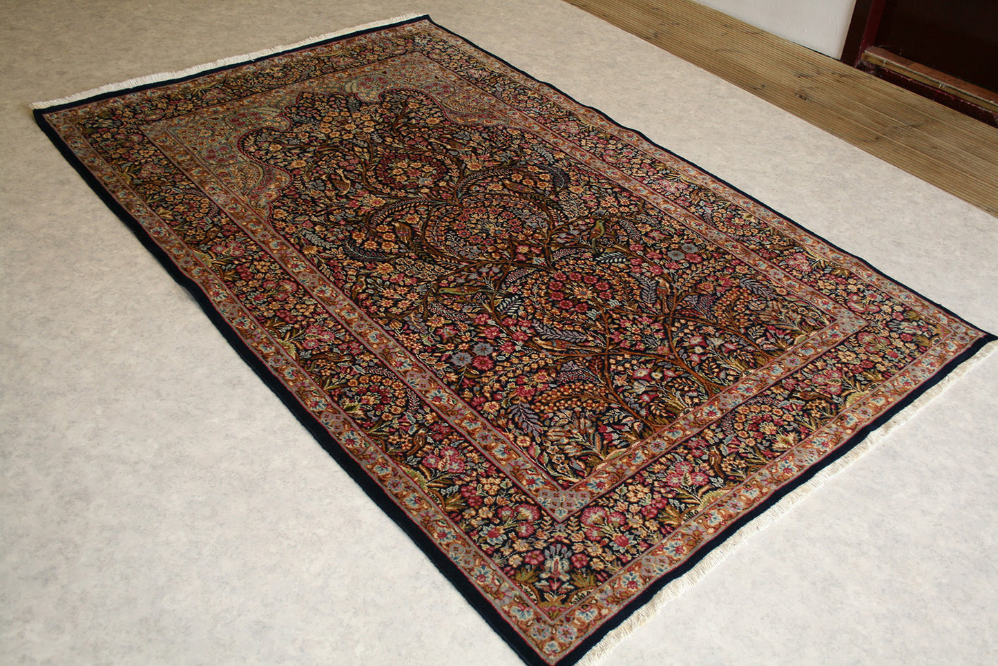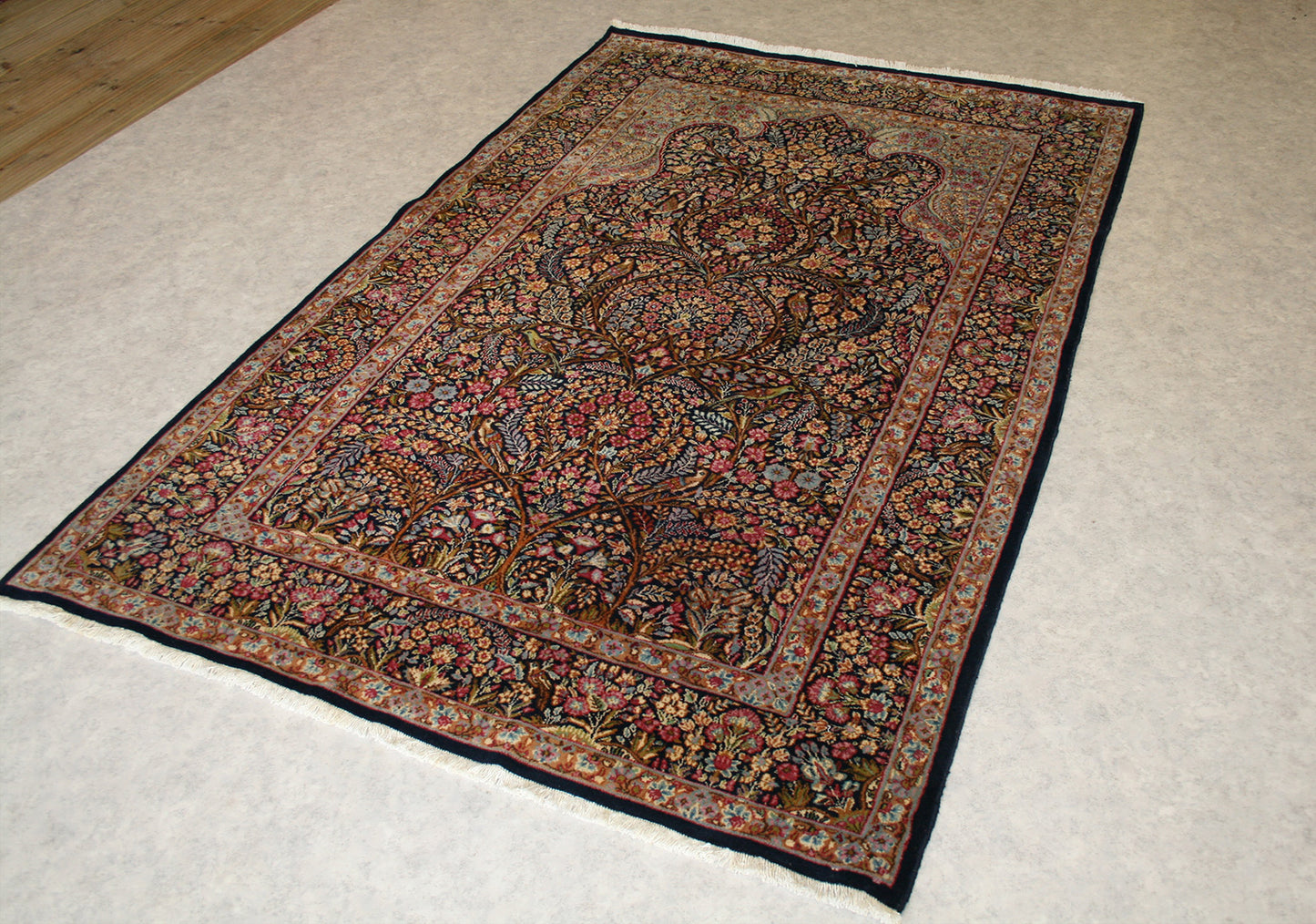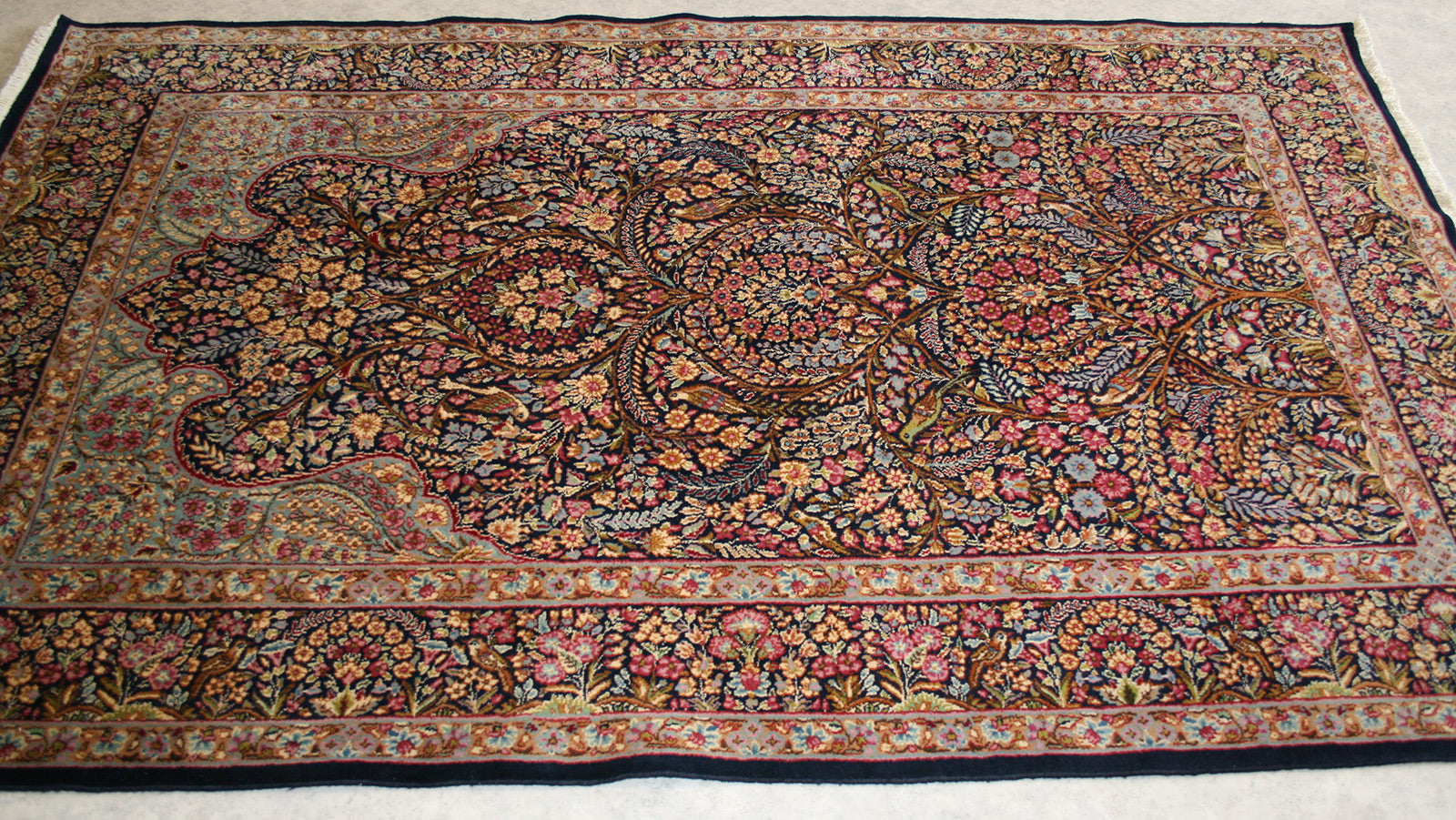 Hand-knotted in the storied workshops of Kerman, this semi-antique Persian rug embodies the grace and symbolism of the mihrab (prayer arch) design. Its navy-blue field, rich with floral tracery, birds, and mirrored symmetry, creates a sense of serenity and devotion.