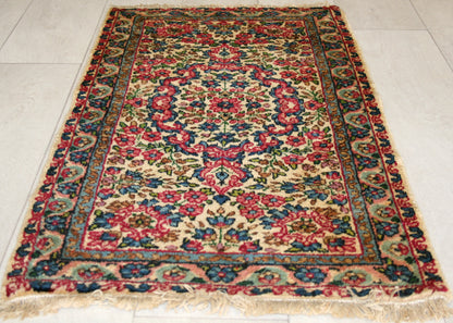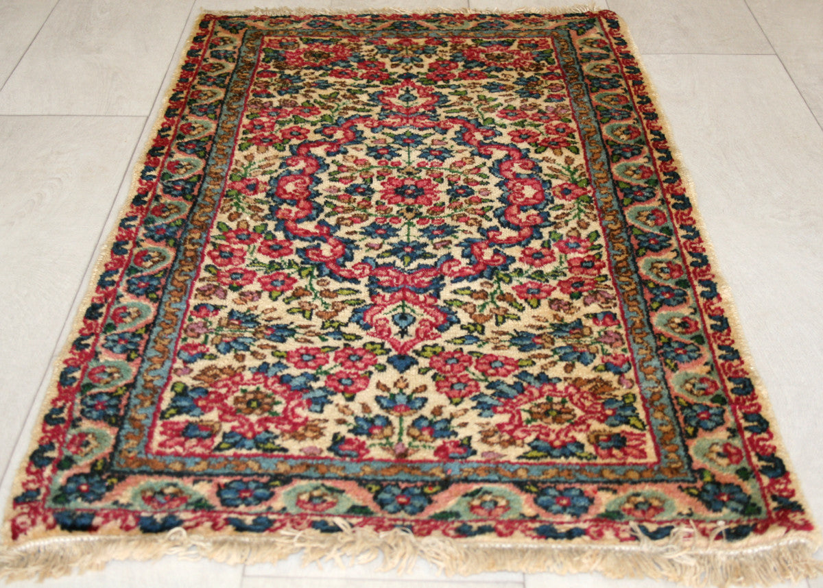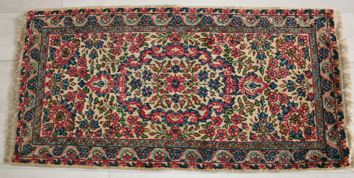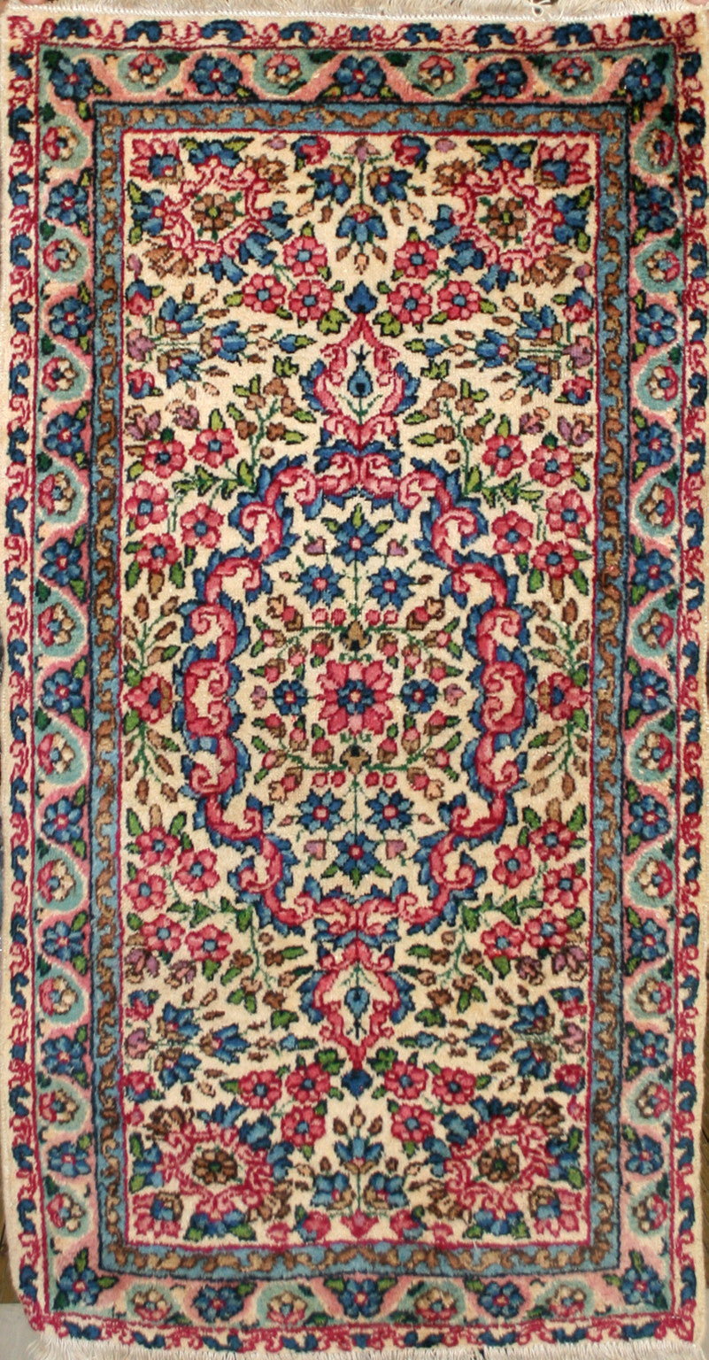 Hand-knotted in the storied workshops of Kerman, this semi-antique Persian rug captures the elegance of classical Persian design in a compact form. Its ivory field is anchored by a floral medallion, framed by flowing vines, rosettes, and palmettes that evoke the rich decorative traditions of the region.