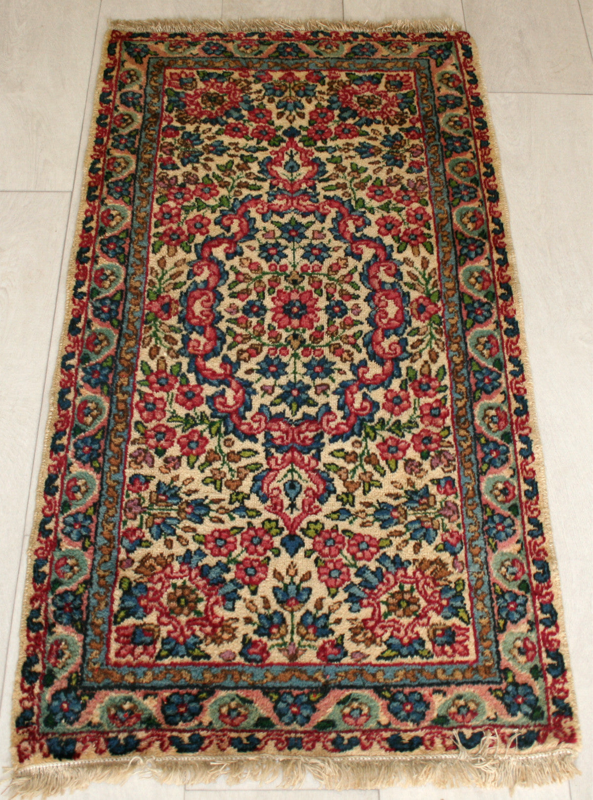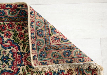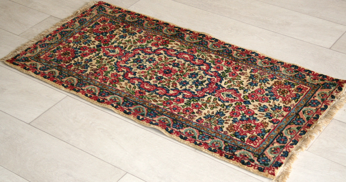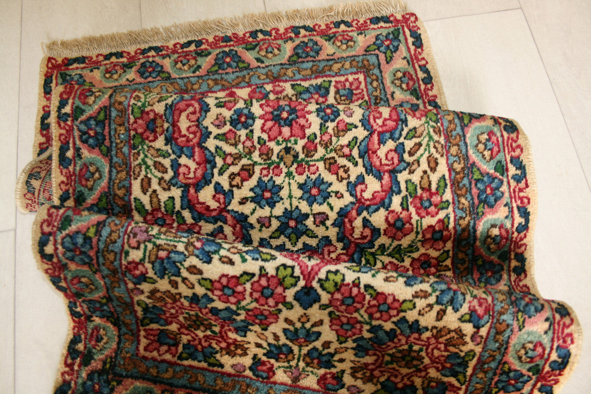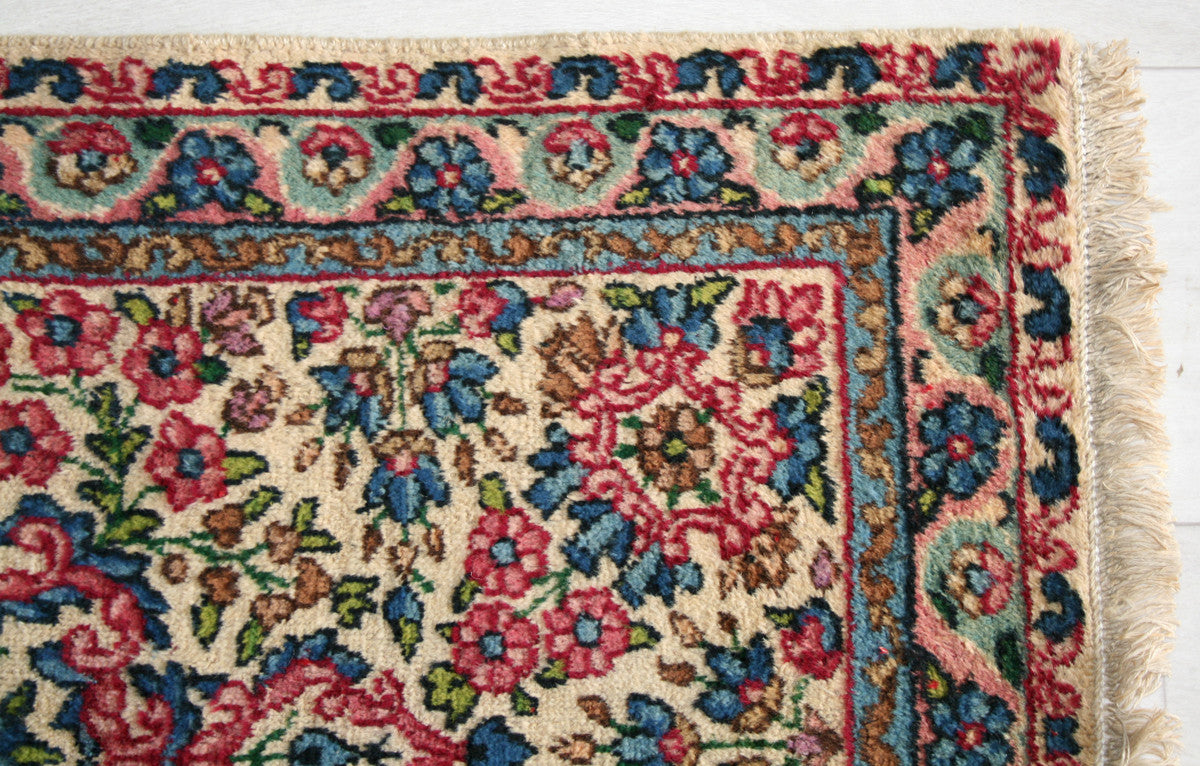 Hand-knotted in the storied workshops of Kerman, this semi-antique Persian rug captures the elegance of classical Persian design in a compact form. Its ivory field is anchored by a floral medallion, framed by flowing vines, rosettes, and palmettes that evoke the rich decorative traditions of the region.