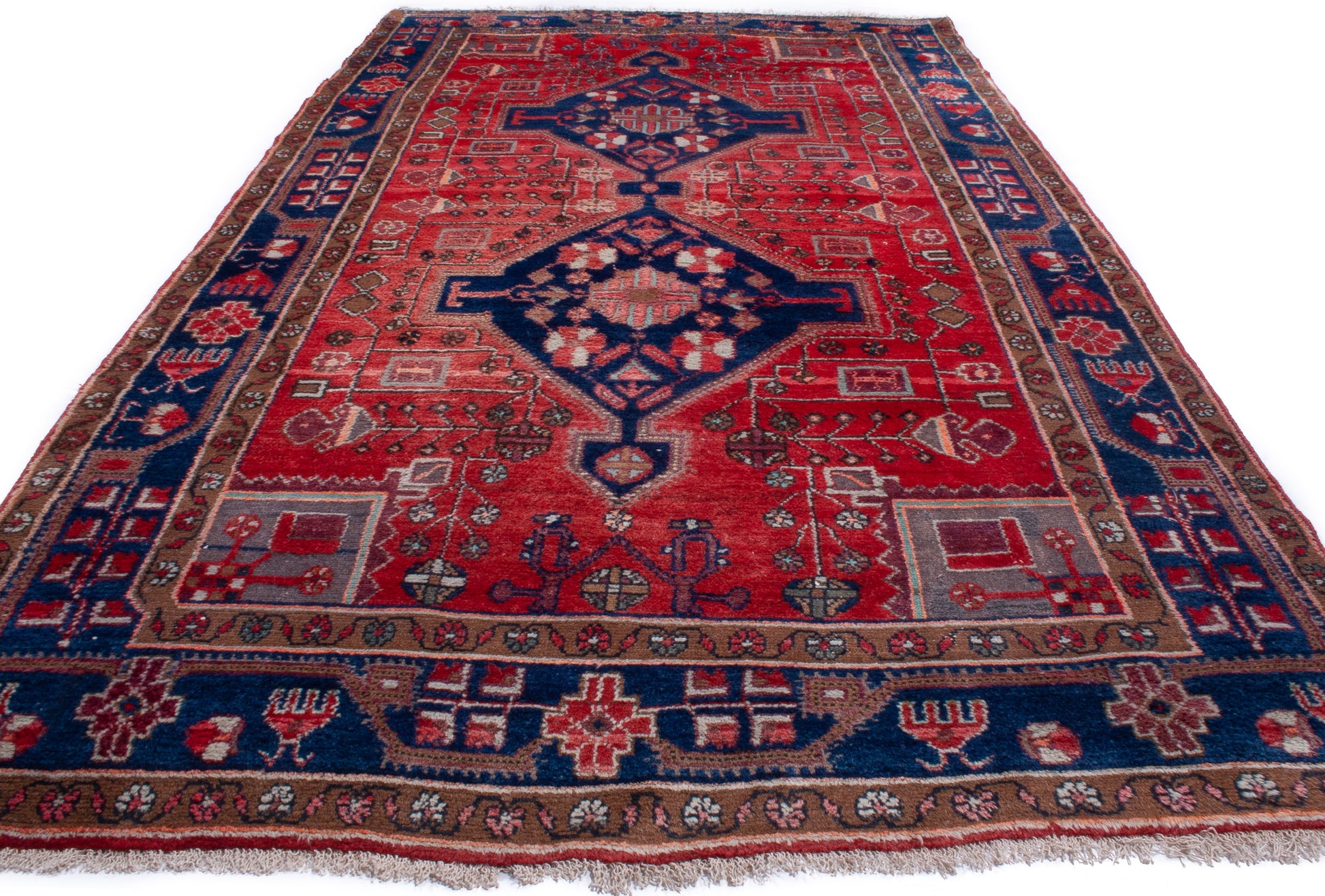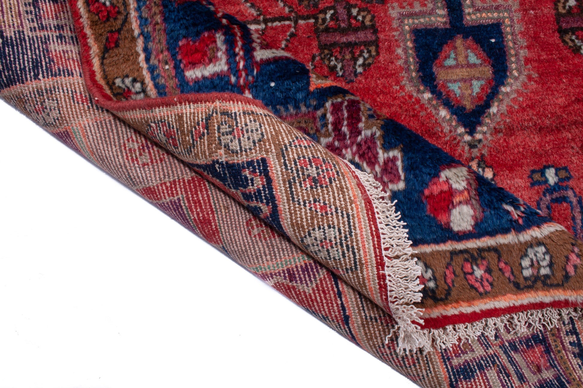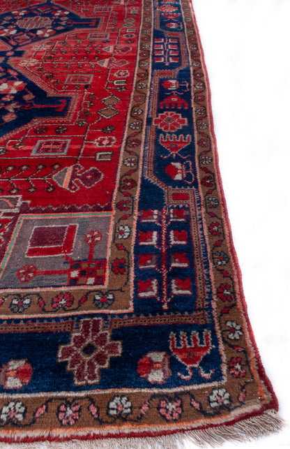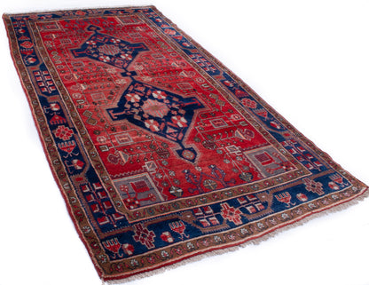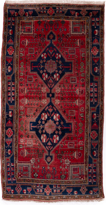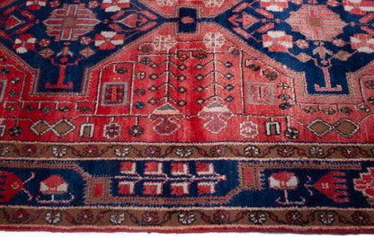 This semi-antique Persian Lori rug embodies the bold, expressive character of tribal weaving. Hand-knotted in Iran, it features a repeat medallion layout with two striking geometric medallions, softened by floral detailing and framed by serrated leaves, palmettes, and rosettes. The mirrored, symmetrical design adds a sense of balance to its dynamic composition.