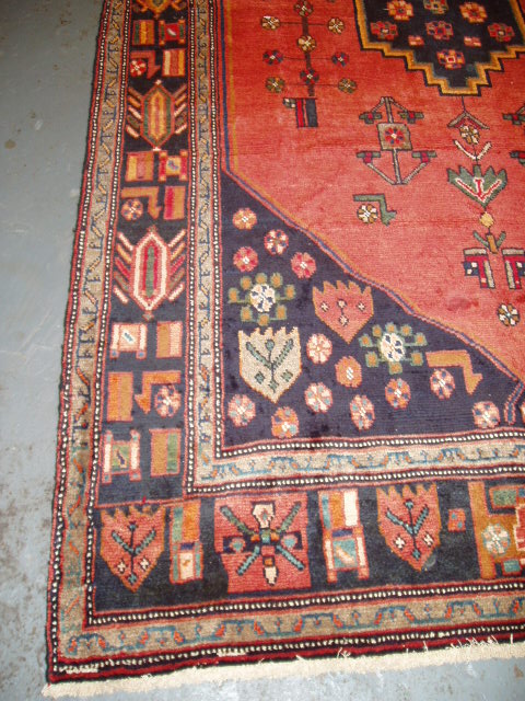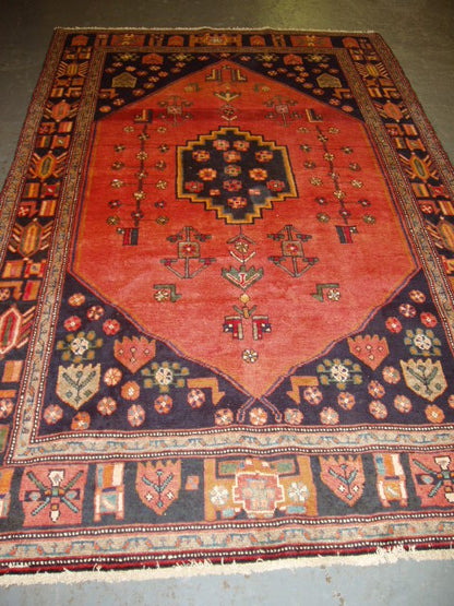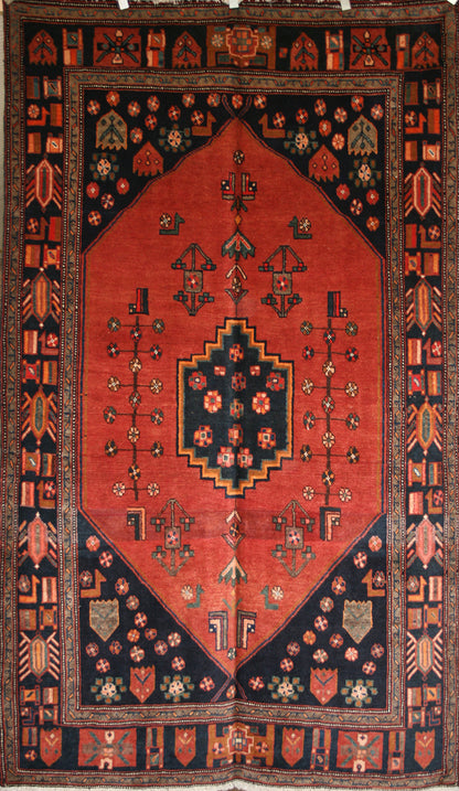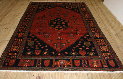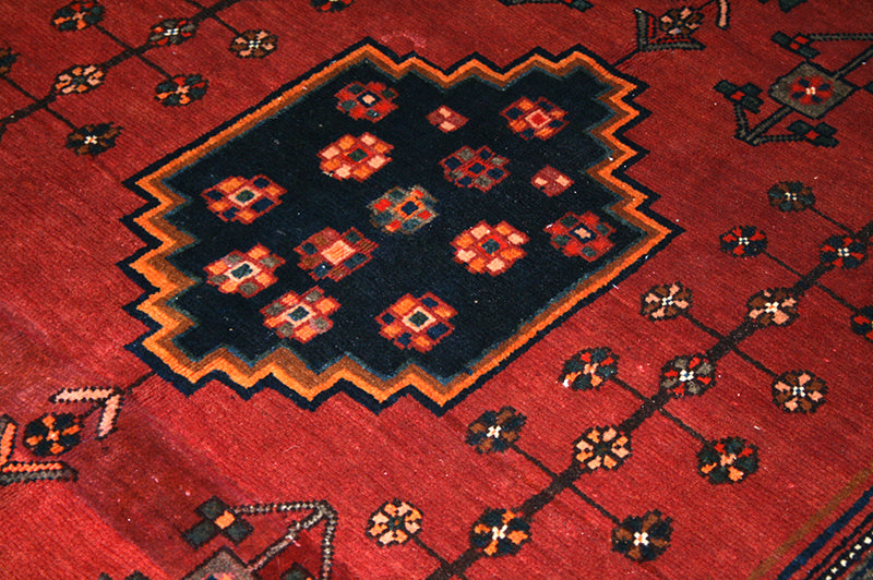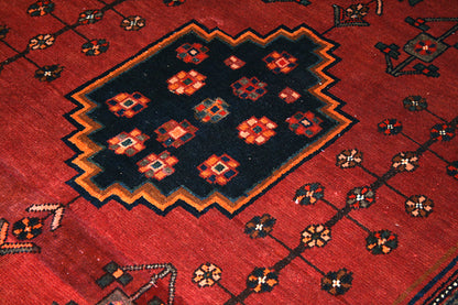Hand-knotted in the tribal regions of Lori, this semi-antique Persian rug embodies the raw beauty and symbolism of tribal weaving. At its heart lies a bold, star-shaped medallion, set against a brick-red field adorned with stylised blossoms, serrated teardrop forms, and ram’s horn motifs—each carrying echoes of protection, strength, and continuity.