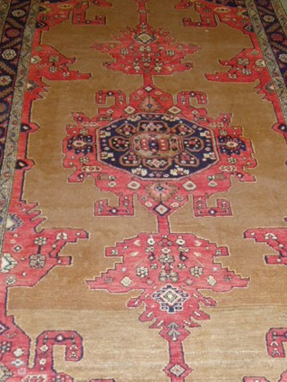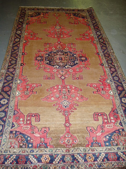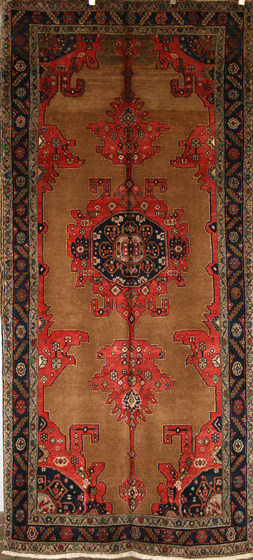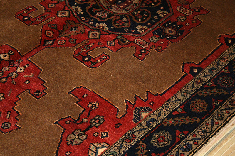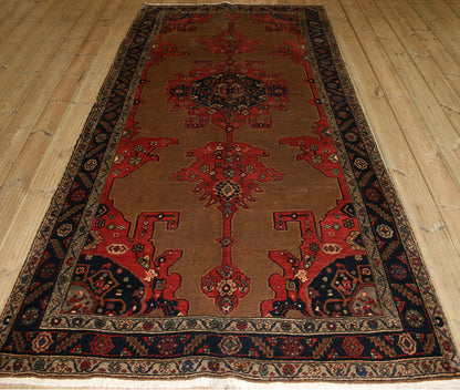 Hand-knotted in the tribal regions of Lori, this semi-antique Persian rug reflects the soul of nomadic craftsmanship. Its central medallion—a bold, geometric form softened by floral influences—sits within a field of earthy brown, flanked by angular, serrated motifs that echo tribal symbolism.
