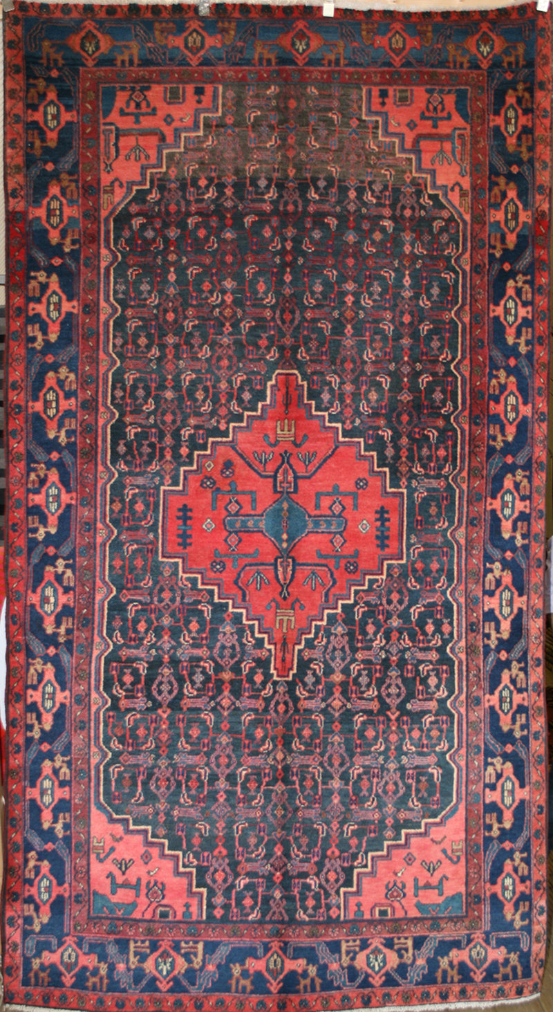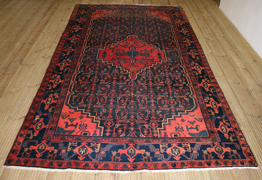 Hand-knotted in Nahavand, Iran, this semi-antique Persian rug embodies the bold, tribal energy of its weaving tradition. Its stepped, central medallion sits within a field of geometric motifs—stylised rosettes and angular forms—arranged in a mirrored, symmetrical layout that reflects the region’s distinctive aesthetic.