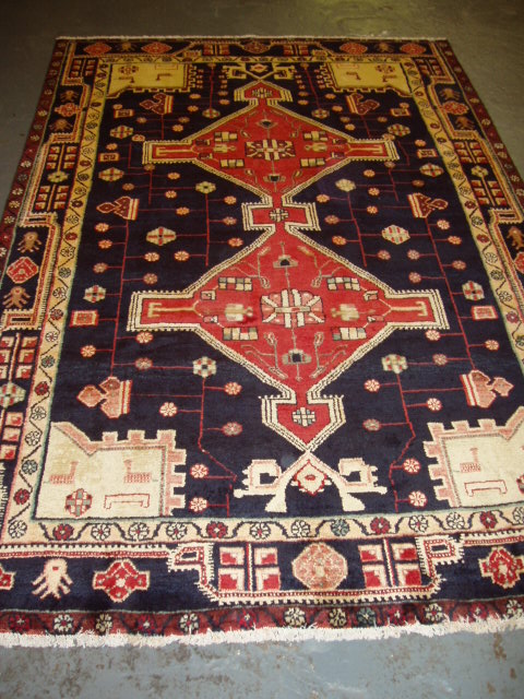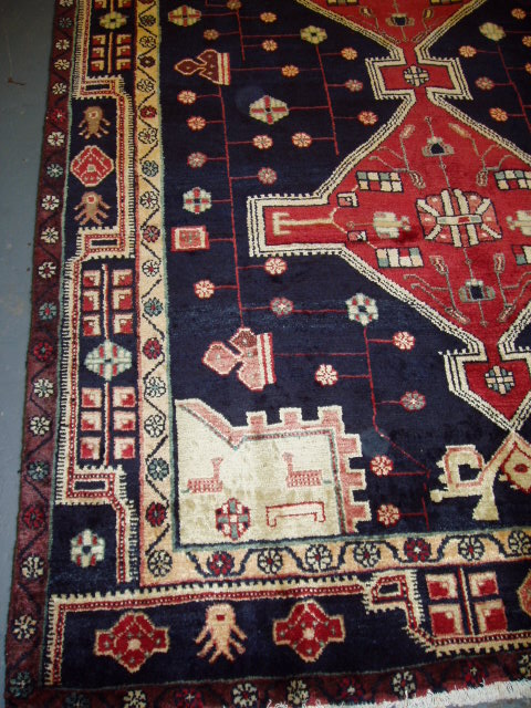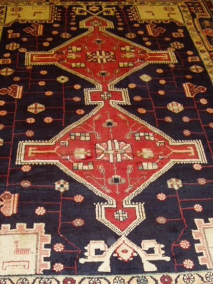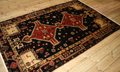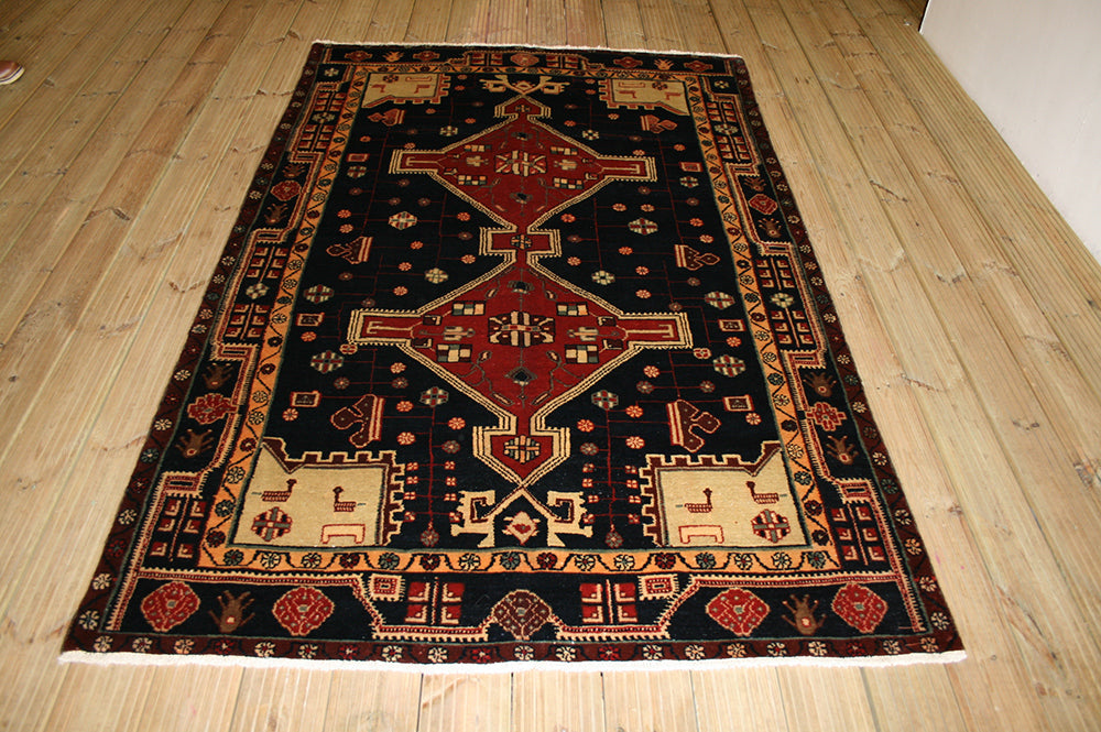 Hand-knotted in the rugged hills of Nahavand, this semi-antique Persian rug embodies the bold spirit of tribal weaving. Its stepped medallion rises from a deep navy field, flanked by stylised rosettes and angular motifs that reflect the region’s geometric tradition.