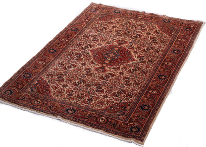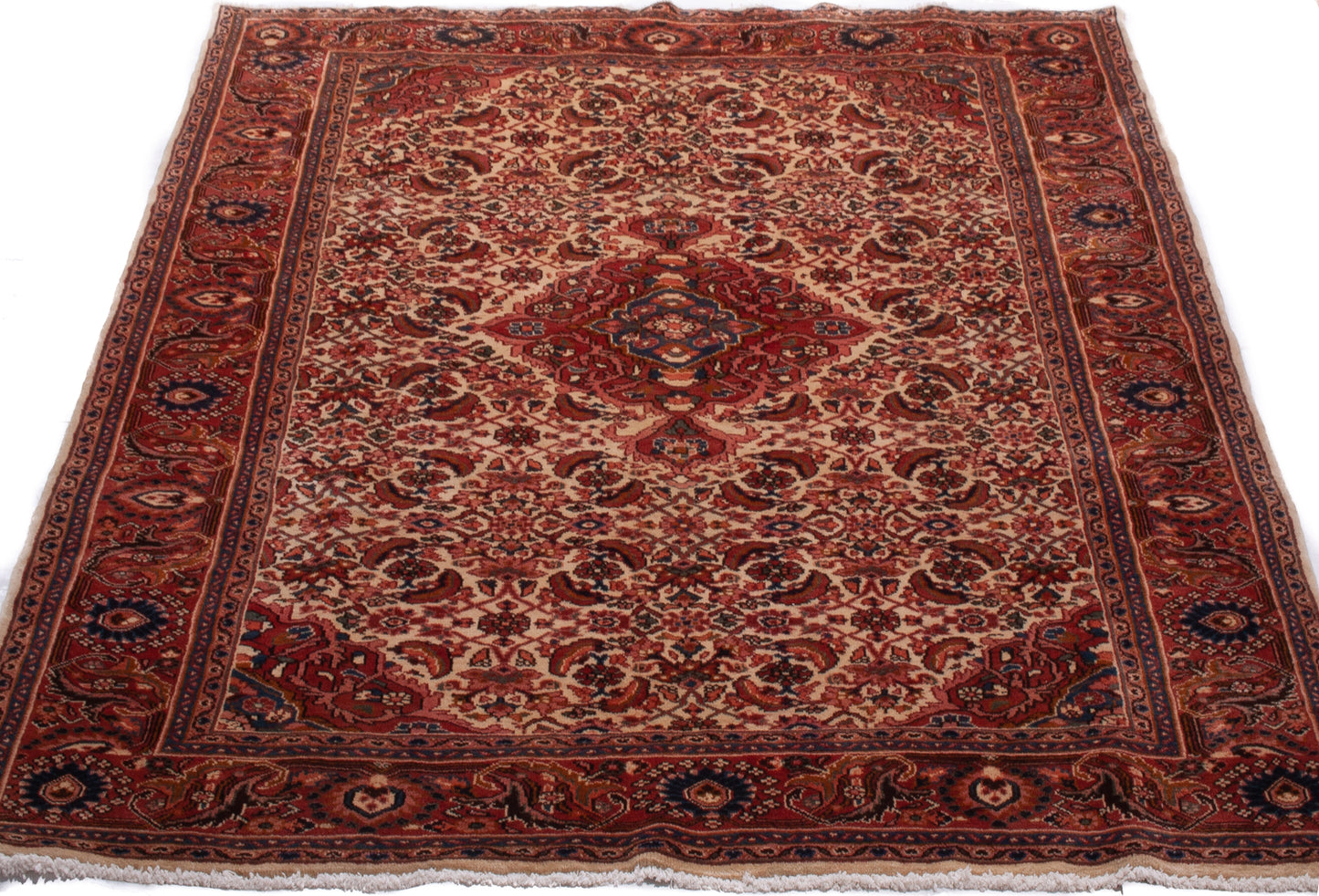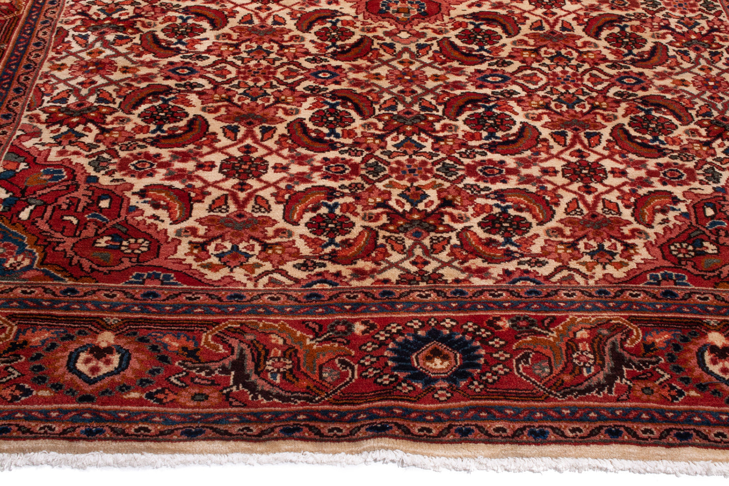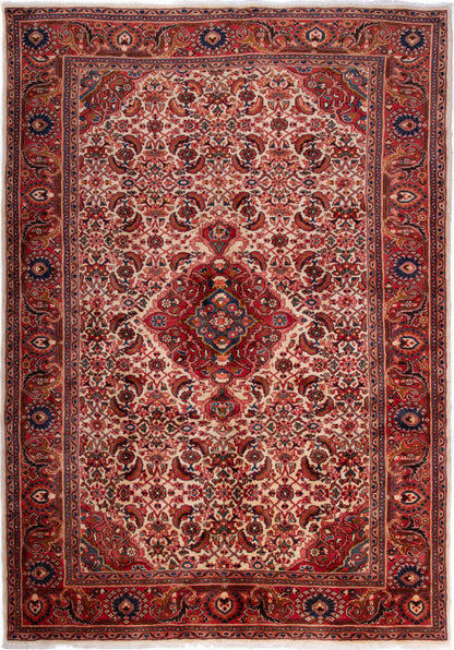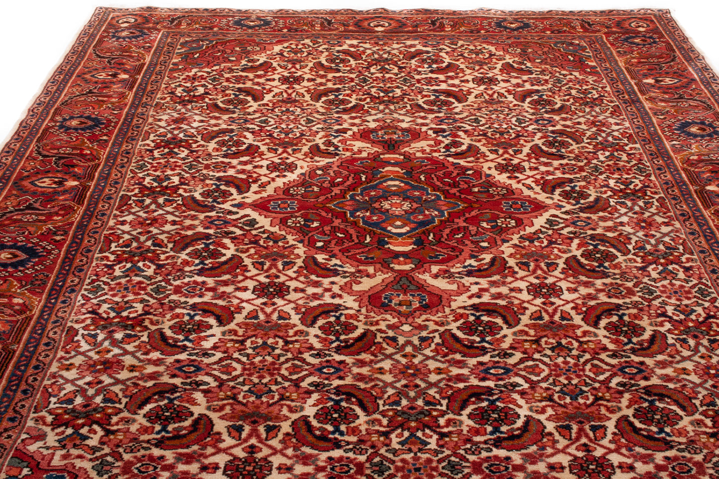 This stunning Semi-Antique Persian Nanaj Rug features a rectangular shape with a central medallion design. The foundation is composed of cotton and the pile is made from wool. It features a geo-floral pattern in shades of red, beige, and blue, reflecting the beauty of the Iranian countryside. Hand-knotted and semi-antique, this rug is sure to become a timeless part of any decor.