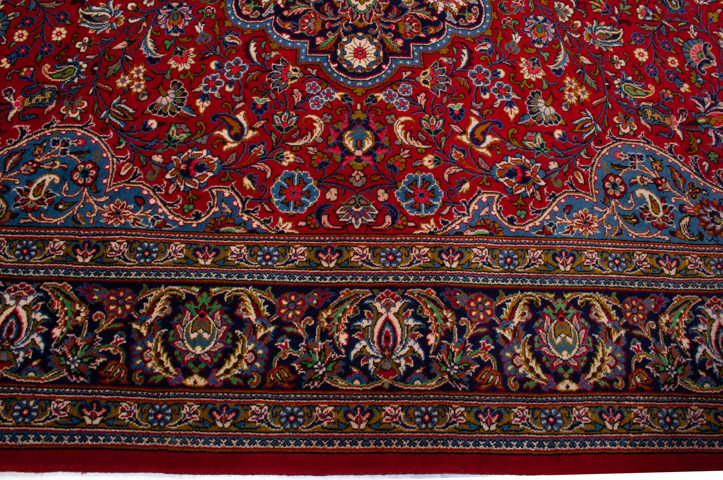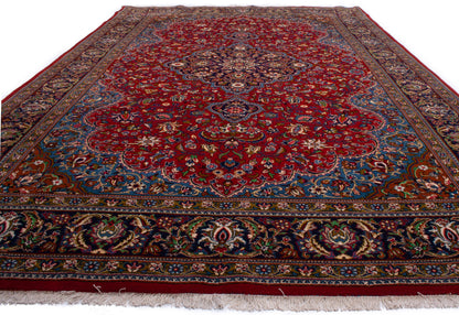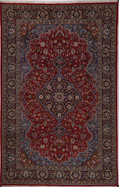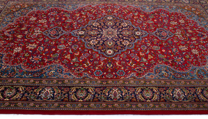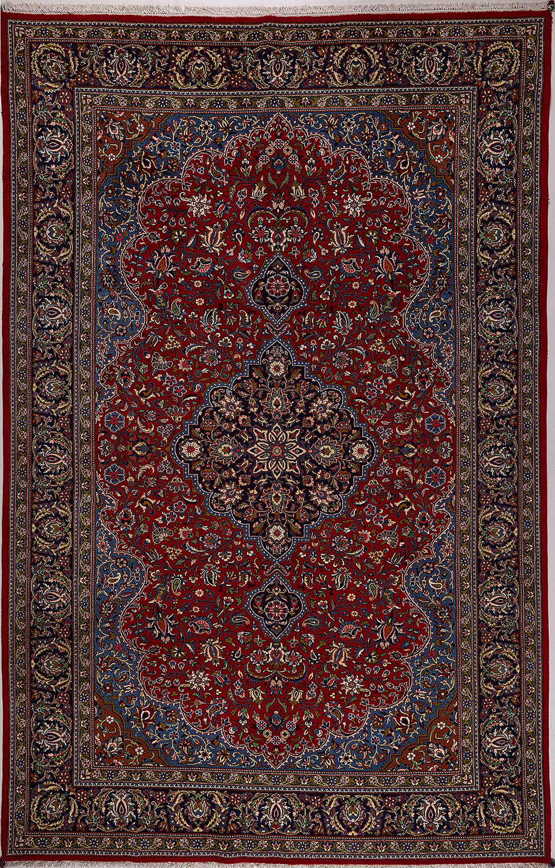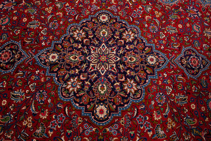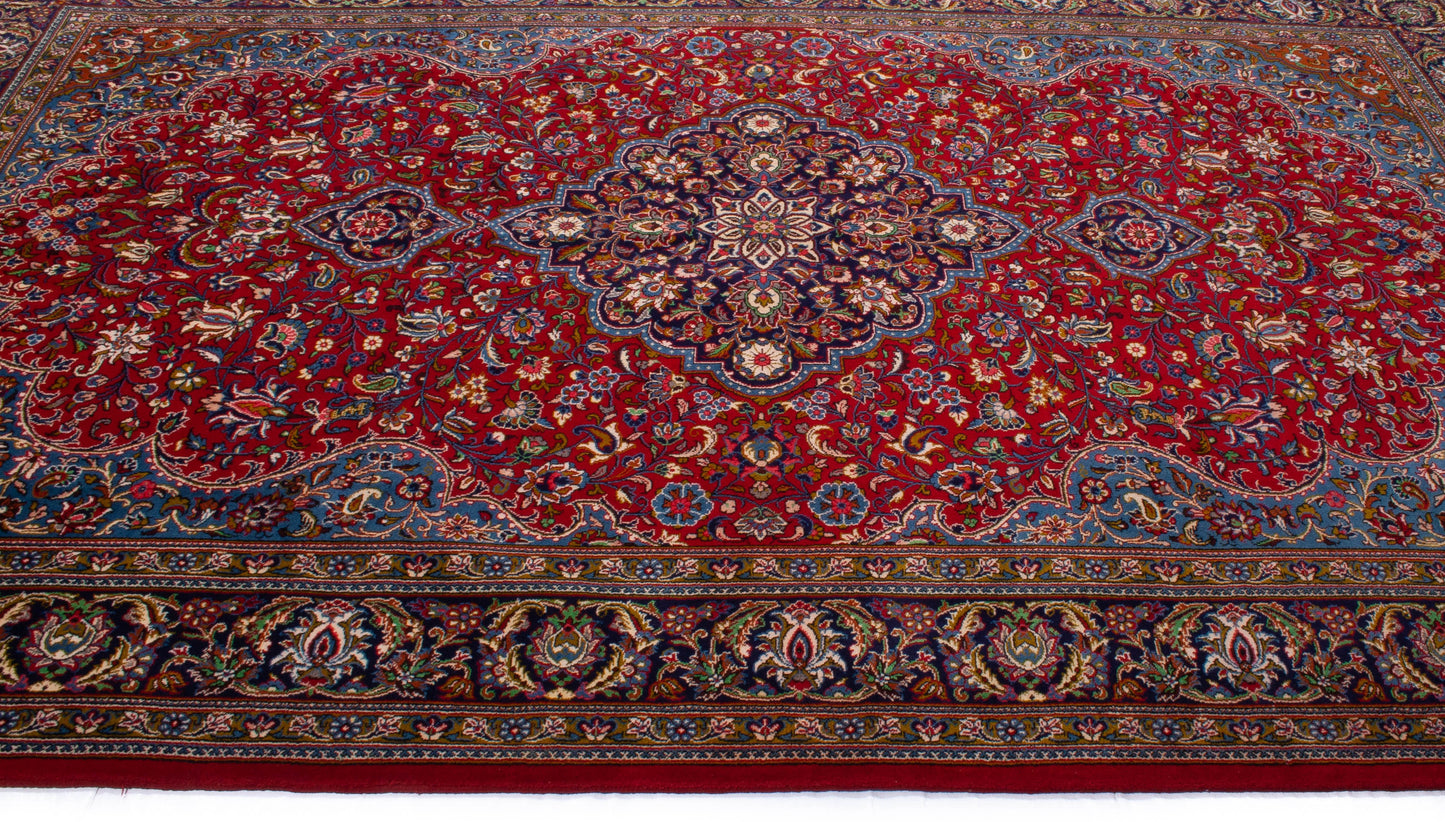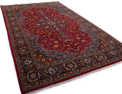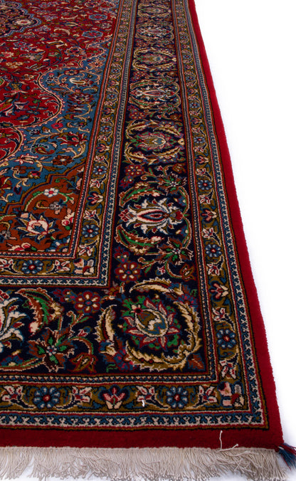 Hand-knotted in Qom, one of Iran’s most revered weaving centres, this semi-antique Persian rug embodies the city’s legacy of precision and refinement. Its lobed, floral medallion rests on a rich crimson field adorned with palmettes, rosettes, and flowing vine motifs, creating a harmonious, symmetrical composition.