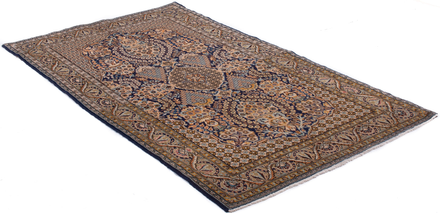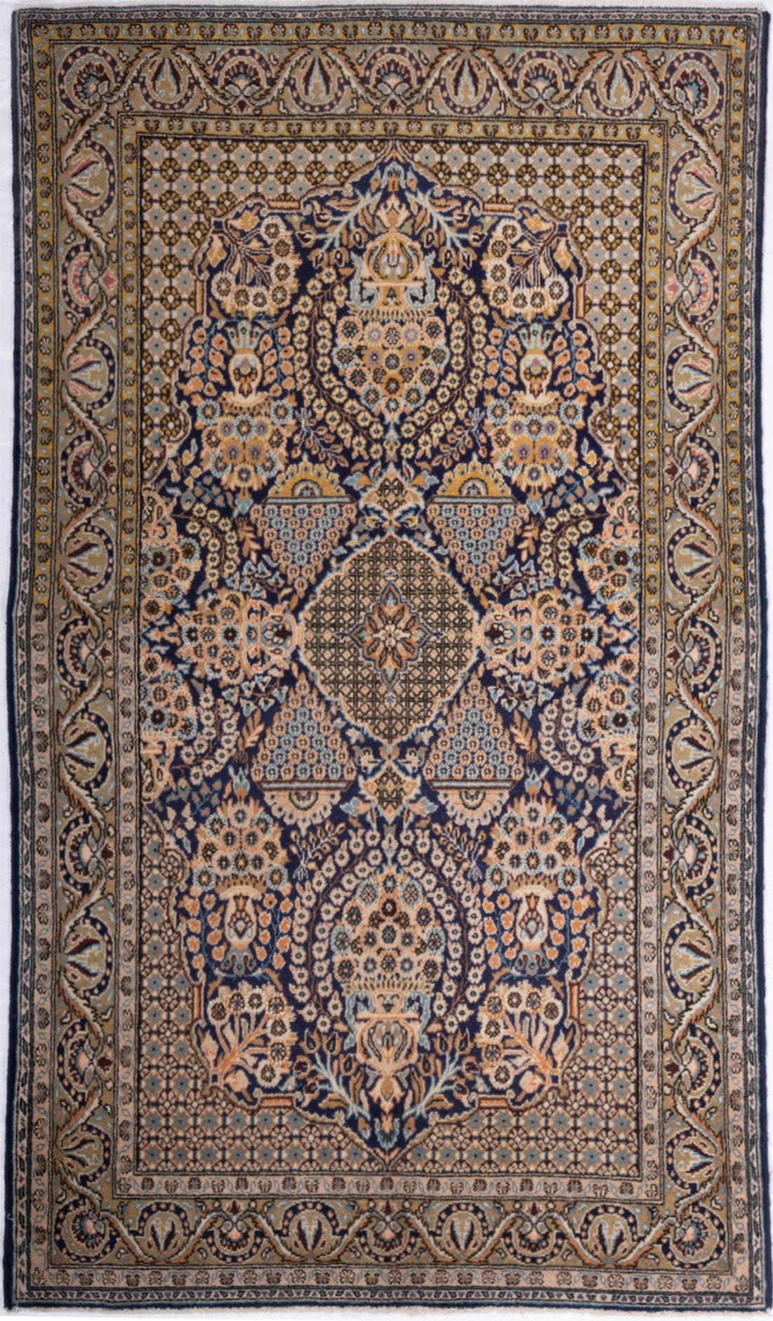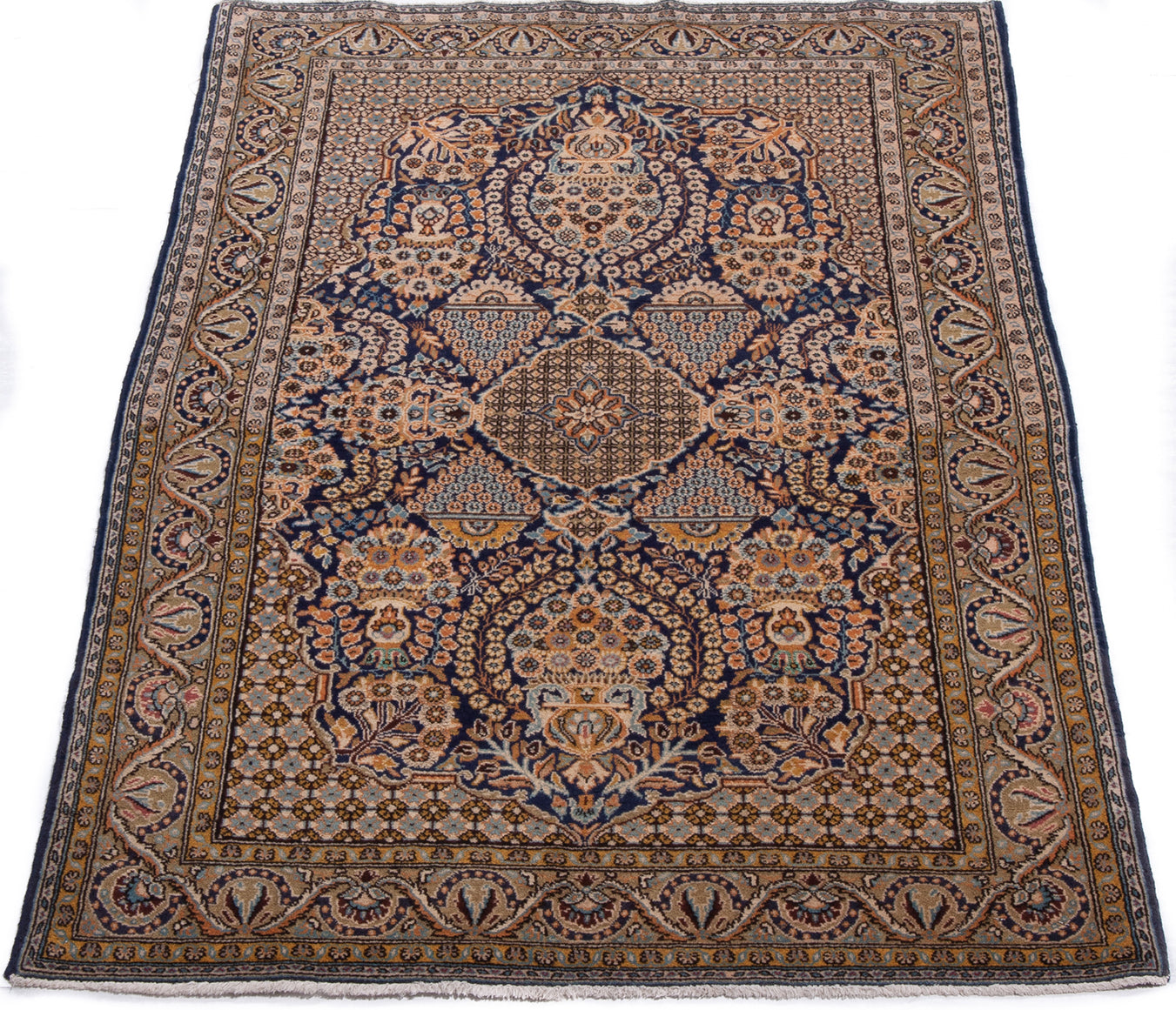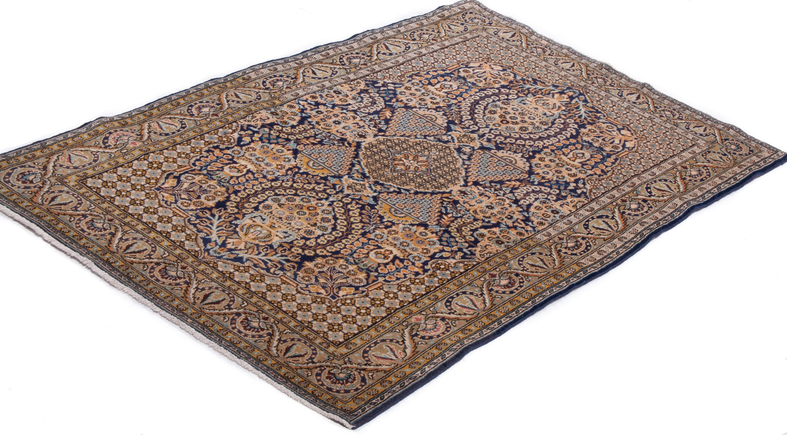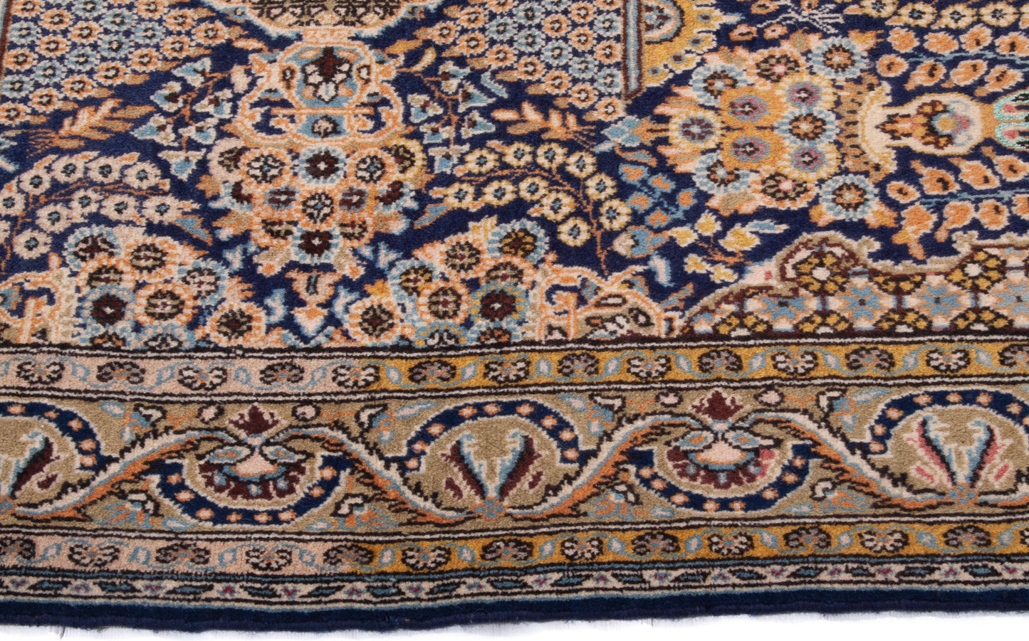 Hand-knotted in Qom, one of Iran’s most revered weaving centres, this semi-antique Persian rug embodies the precision and artistry that define the city’s legacy. Its central medallion, set against a navy field, is framed by palmettes, rosettes, and stylised floral elements, arranged in a mirrored, lattice-like composition that balances structure with fluidity.
