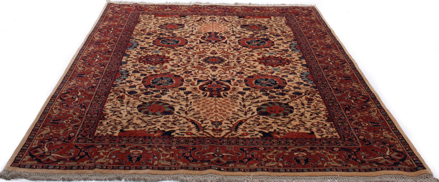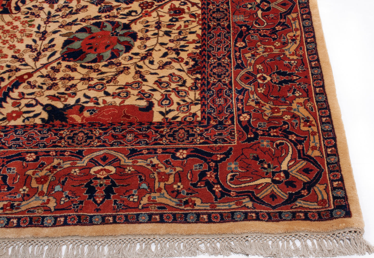 The beige field provides a gentle backdrop for the floral motifs, enriched by tones of deep red, midnight blue, and sage green. A deep red border frames the composition with repeating palmettes and scrolling vines, flanked by delicate guard bands that add structure and continuity.