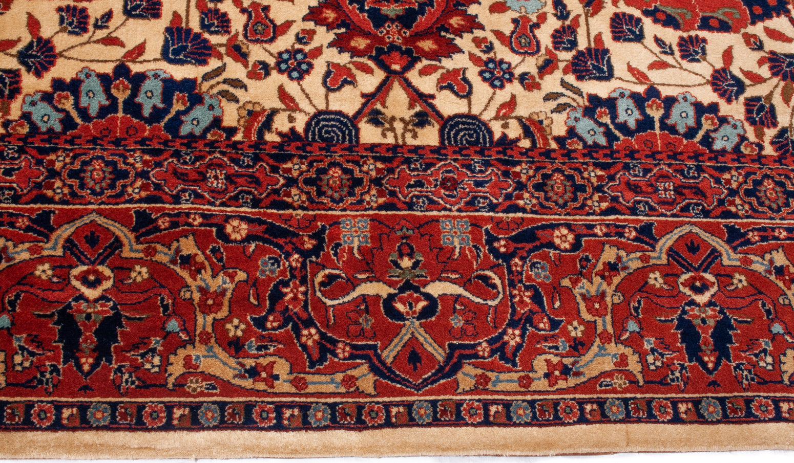 Hand-knotted in the storied weaving centre of Sarouk, this semi-antique Persian rug exemplifies the enduring elegance of Persian craftsmanship. Its all-over floral design, anchored by palmettes, rosettes, and scrolling vines, unfolds in a perfectly mirrored layout, creating a sense of balance and refinement.