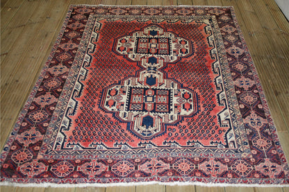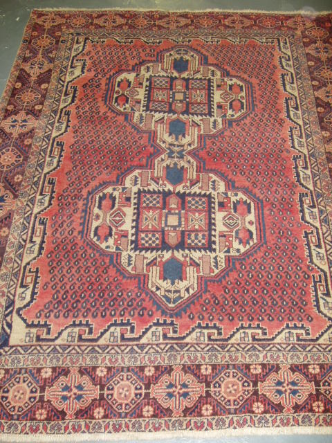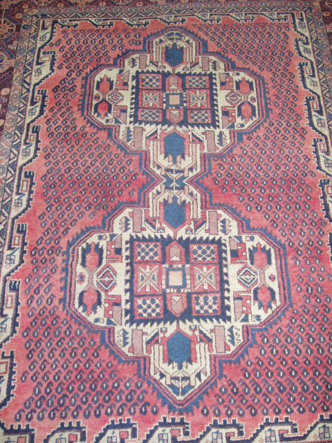 This semi-antique Persian Sirjan rug has a hand-knotted construction made in Iran with cotton foundation, wool pile, and a geometric design. The colors are a striking combination of salmon, blue, and ivory, framed in a repeat medallion pattern. Perfect for a classy look and lasting quality.