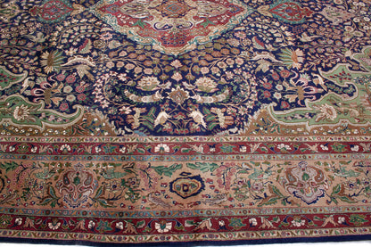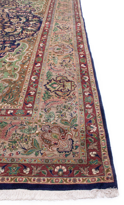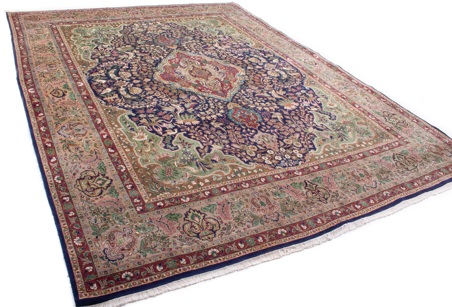 Hand-knotted in Tabriz, one of Persia’s most celebrated weaving centres, this semi-antique rug reflects the city’s long-standing tradition of precision and artistry. Its lobed medallion sits proudly on a navy-blue field, surrounded by floral palmettes, scrolling vines, and delicately balanced spandrels, all arranged in a symmetrical, flowing layout.