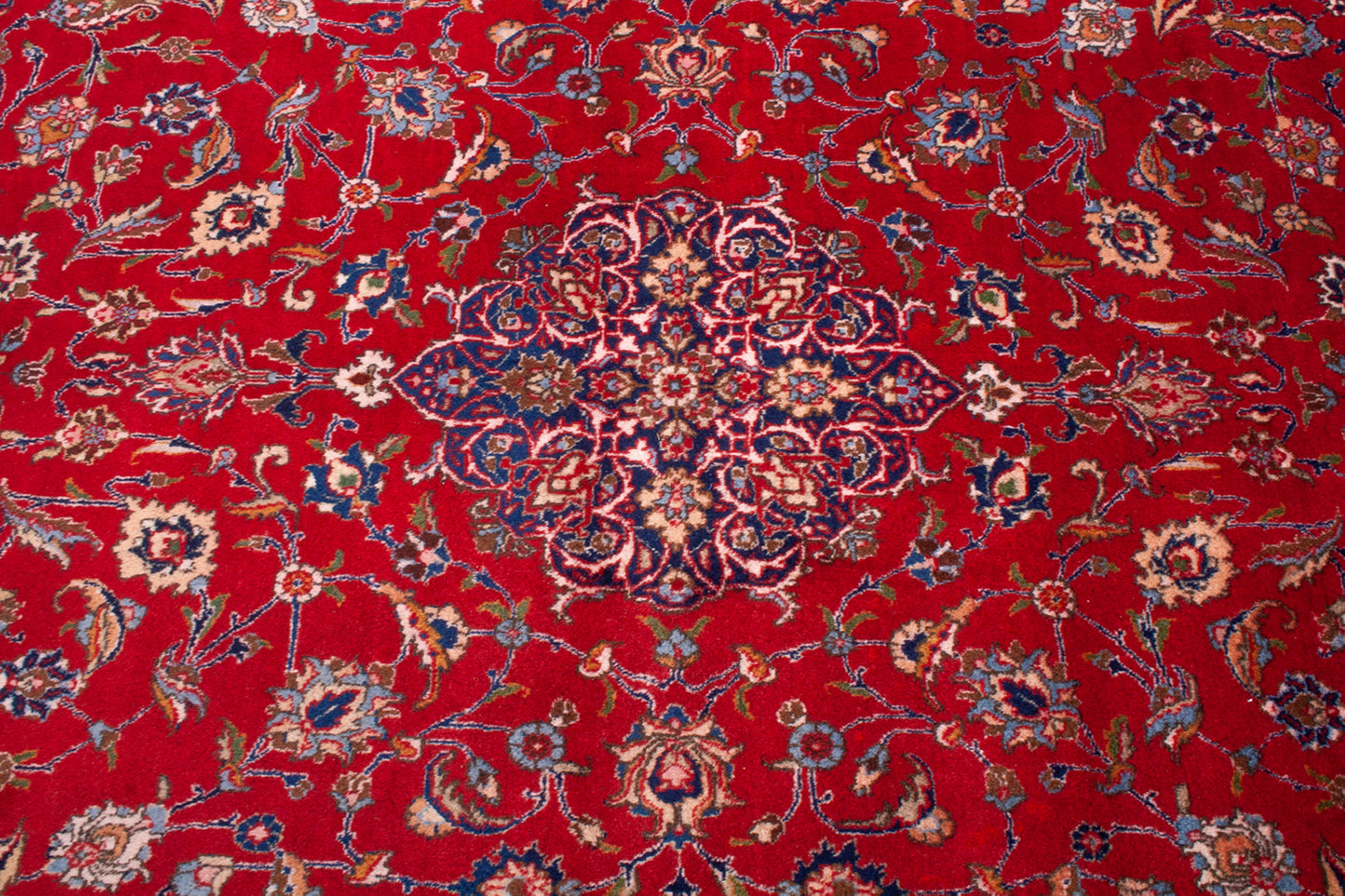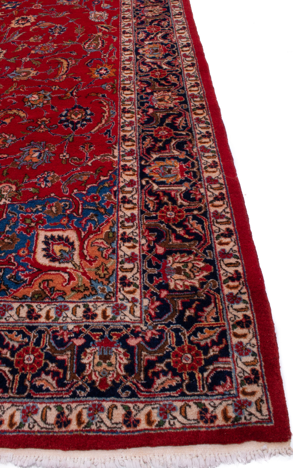The rug showcases a harmonious blend of intricate floral motifs and arabesque patterns, set against a deep red field. The central medallion, a hallmark of Tabriz design, is surrounded by a series of symmetrical floral arrangements, accentuated by rich blues and subtle ivory tones. The border is a continuation of this intricate design, featuring a series of interconnected floral and vine motifs that add to the rug’s visual depth and complexity.