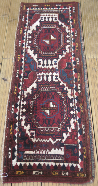 This semi-antique Persian Turkmen rug captures the bold geometry and symbolic richness of tribal weaving. Hand-knotted in Iran, it features a repeat medallion design with two prominent hexagonal medallions set against a mirrored field of stepped forms and cross-like motifs.