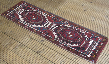 The deep burgundy and ivory palette is punctuated by accents of dark blue, chocolate brown, and mustard yellow, creating a striking interplay of colour and form. The main border, adorned with hooked motifs, reinforces the rug’s symmetry and frames the central design with clarity and strength.