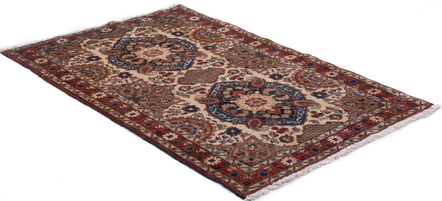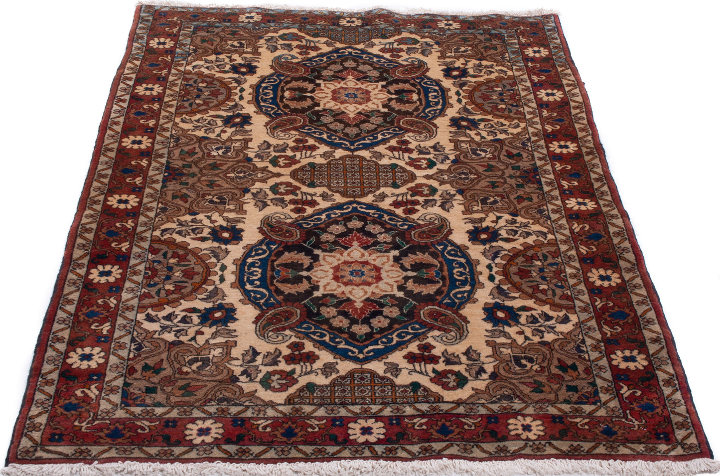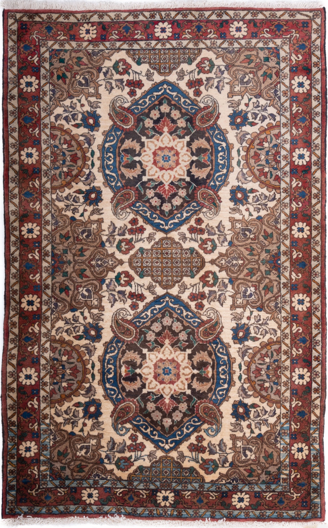 Hand-knotted in the weaving heartland of Varamin, this semi-antique Persian rug reflects a tradition of balance and repetition. Its vertically aligned medallions, floral yet geometric, sit within an ivory field adorned with stylised vine motifs and delicate rosettes, creating a sense of quiet symmetry.