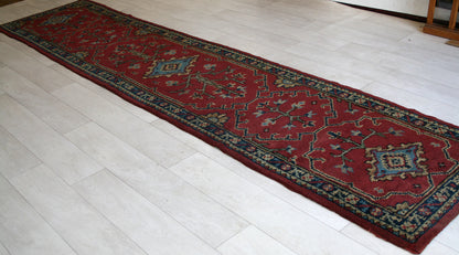 Hand-knotted in Ushak, Turkey, this semi-antique runner embodies the region’s storied weaving tradition, renowned for its bold medallion layouts and harmonious symmetry. A series of diamond-shaped medallions anchors the design, softened by stylised floral motifs that balance geometry with organic detail.