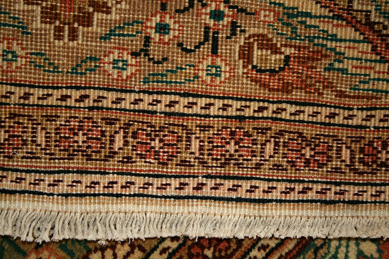 The earthy palette of beige, walnut brown, and sage green is softened by touches of burnt orange and soft blue, creating a harmonious interplay of tone. A scrolling vine border on a walnut ground frames the design, reinforced by layered guard bands that add structure and rhythm.