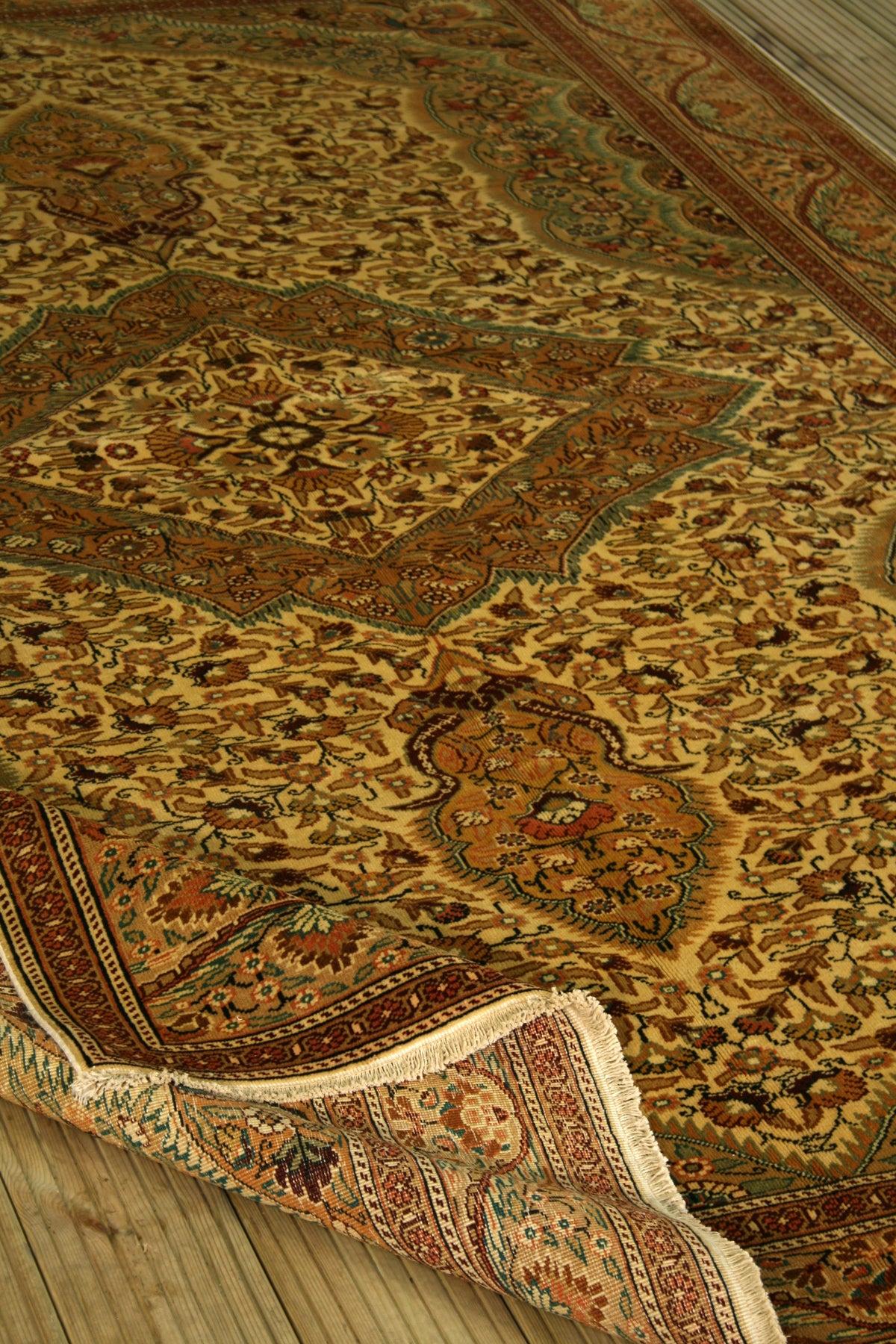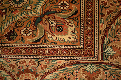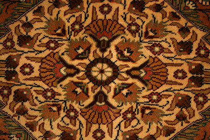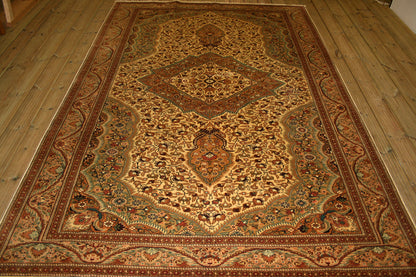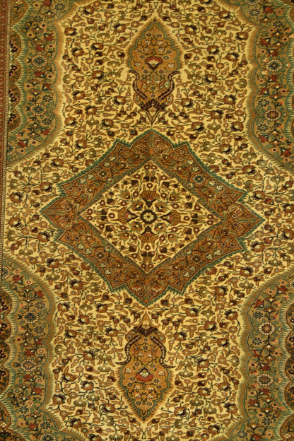 Hand-knotted in Kayseri, this Turkish rug exemplifies the region’s tradition of fine craftsmanship and decorative refinement. At its heart lies a diamond-shaped medallion, rich with floral detail, set within a field of palmettes, rosettes, and stylised vines. Symmetrical spandrels and a tightly arranged layout enhance the sense of balance and intricacy.