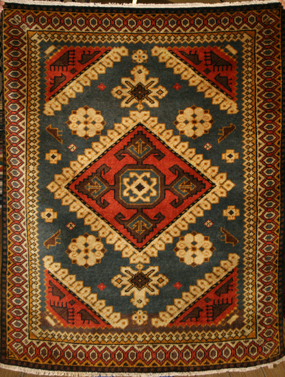 The earthy palette of rust red, deep teal, and walnut brown is enriched by accents of mustard yellow and beige, creating a striking interplay of tone and texture. A rust-toned border of alternating diamonds, flanked by zigzag guard bands, reinforces the rug’s geometric rhythm.